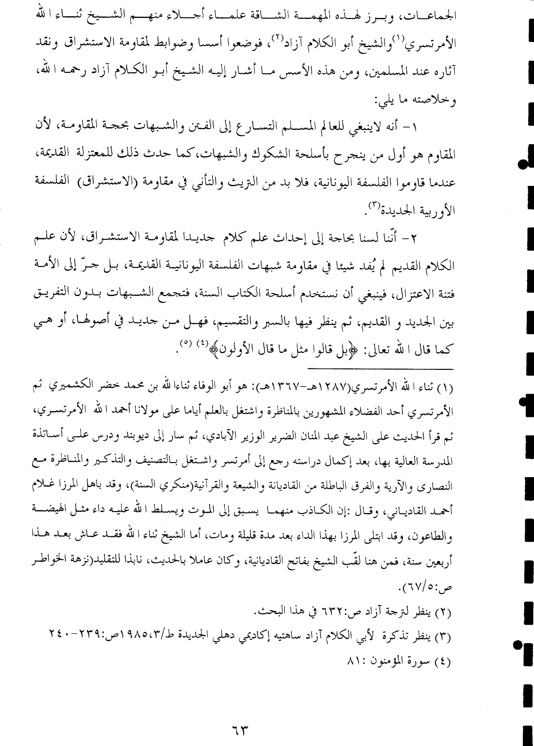 الجماعات، وبرز لهذه المهمة الشاقة علماء أجلاء منهم الشيخ ثناء الله الأمرتسري (¬١) والشيخ أبو الكلام آزاد (¬٢)، فوضعوا أسسا وضوابط لمقاومة الاستشراق ونقد آثاره عند المسلمين، ومن هذه الأسس ما أشار إليه الشيخ أبو الكلام آزاد رحمه الله، وخلاصته ما يلي: