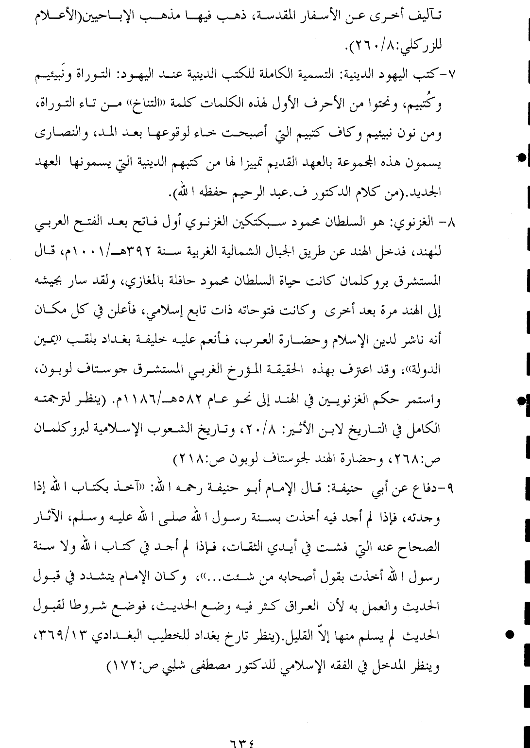٨ - الغزنوي: هو السلطان محمود سبكتكين الغزنوي أول فاتح بعد الفتح العربي للهند، فدخل الهند عن طريق الجبال الشمالية الغربية سنة ٣٩٢ هـ / ١٠٠١ م، قال المستشرق بروكلمان كانت حياة السلطان محمود حافلة بالمغازي، ولقد سار بجيشه إلى الهند مرة بعد أخرى وكانت فتوحاته ذات تابع إسلامي، فأعلن في كل مكان أنه ناشر لدين الإسلام وحضارة العرب، فأنعم عليه خليفة بغداد بلقب "يمين الدولة"، وقد اعترف بهذه الحقيقة المؤرخ الغربي المستشرق جوستاف لوبون، واستمر حكم الغزنويين في الهند إلى نحو عام ٥٨٢ هـ / ١١٨٦ م. (ينظر لترجمته الكامل في التاريخ لابن الأثير: ٨/ ٢٠، وتاريخ الشعوب الإسلامية لبروكلمان ص: ٢٦٨، وحضارة الهند لجوستاف لوبون ص: ٢١٨). ٩ - دفاع عن أبي حنيفة: قال الإمام أبو حنيفة رحمه الله: "آخذ بكتاب الله إذا وجدته، فإذا لم أجد فيه أخذت بسنة رسول الله صلى الله عليه وسلم، الآثار الصحاح عنه التي فشت في أيدي الثقات، فإذا لم أجد في كتاب الله ولا سنة رسول الله أخذت بقول أصحابه من شئت ... "، وكان الإمام يتشدد في قبول الحديث والعمل به لأن العراق كثر فيه وضع الحديث، فوضع شروطا لقبول الحديث لم يسلم منها إلّا القليل. (ينظر تارخ بغداد للخطيب البغدادي ١٣/ ٣٦٩، وينظر المدخل في الفقه الإسلامي للدكتور مصطفى شلبي ص: ١٧٢).