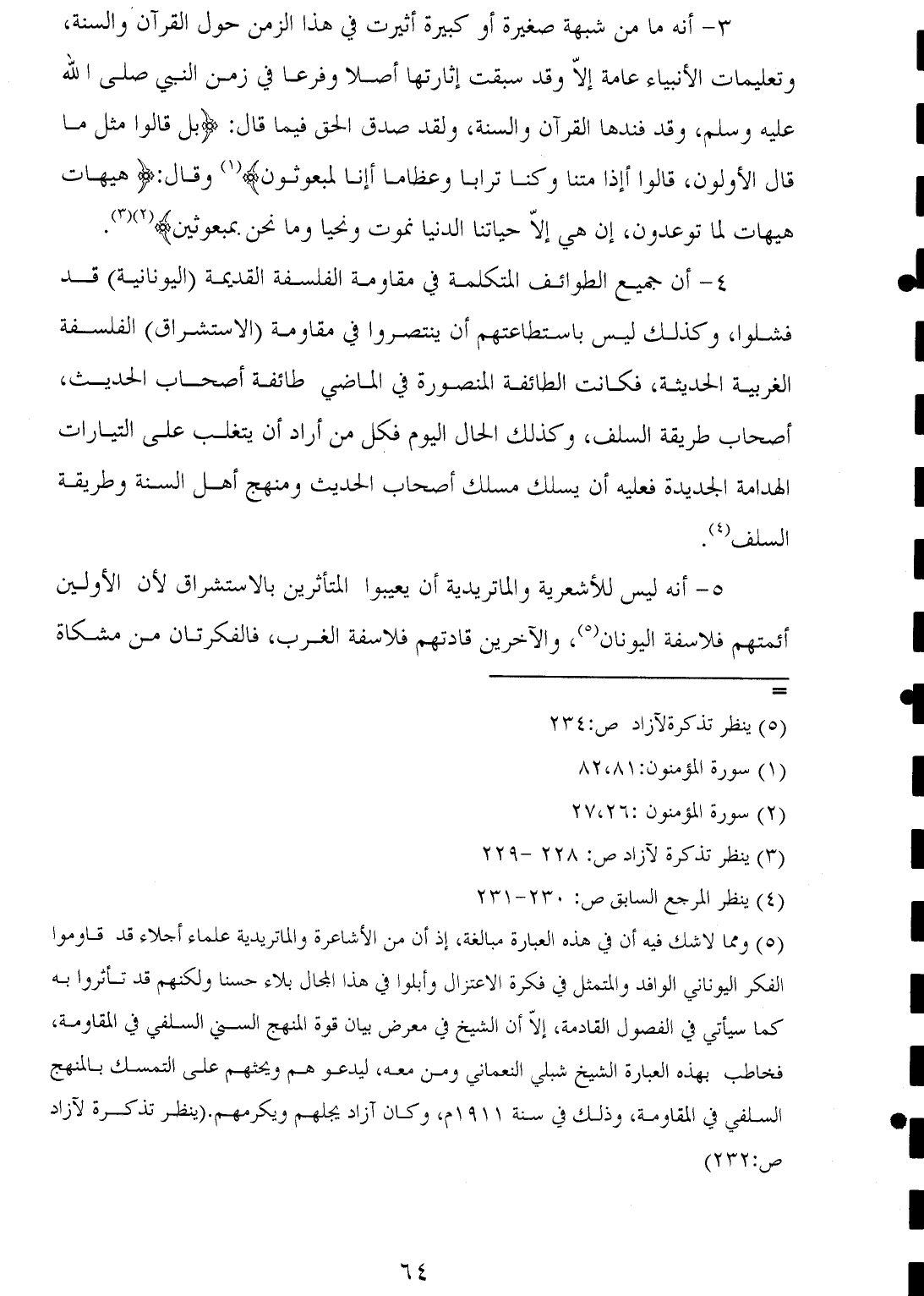 (¬٥) ومما لا شك فيه أن في هذه العبارة مبالغة، إذ أن من الأشاعرة والماتريدية علماء أجلاء قد قاوموا الفكر اليوناني الوافد والمتمثل في فكرة الاعتزال وأبلوا في هذا المجال بلاء حسنا ولكنهم قد تأثروا به كما سيأتي في الفصول القادمة، إلّا أن الشيخ في معرض بيان قوة المنهج السني السلفي في المقاومة، فخاطب بهذه العبارة الشيخ شبلي النعماني ومن معه، ليدعوهم ويحثهم على التمسك بالمنهج السلفي في المقاومة، وذلك في سنة ١٩١١ م، وكان آزاد يجلهم ويكرمهم. (ينظر تذكرة لآزاد ص: ٢٣٢).