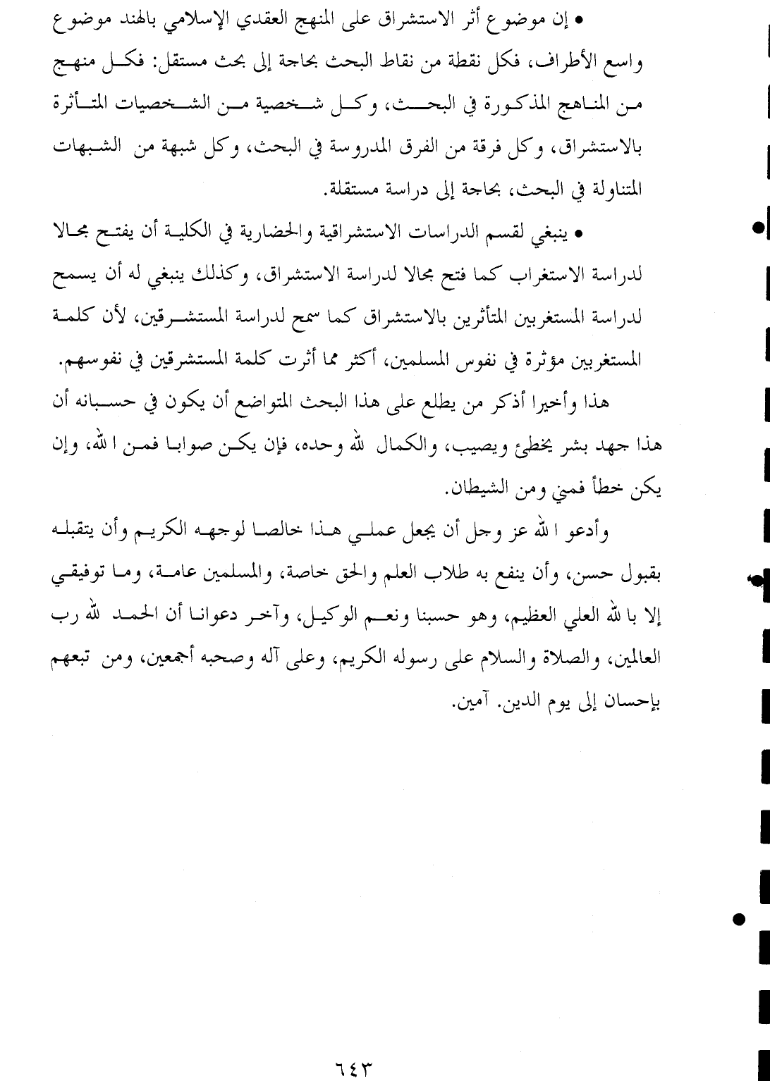 * إن موضوع أثر الاستشراق على المنهج العقدي الإسلامي بالهند موضوع واسع الأطراف، فكل نقطة من نقاط البحث بحاجة إلى بحث مستقل: فكل منهج من المناهج المذكورة في البحث، وكل شخصية من الشخصيات المتأثرة بالاستشراق، وكل فرقة من الفرق المدروسة في البحث، وكل شبهة من الشبهات المتناولة في البحث، بحاجة إلى دراسة مستقلة.