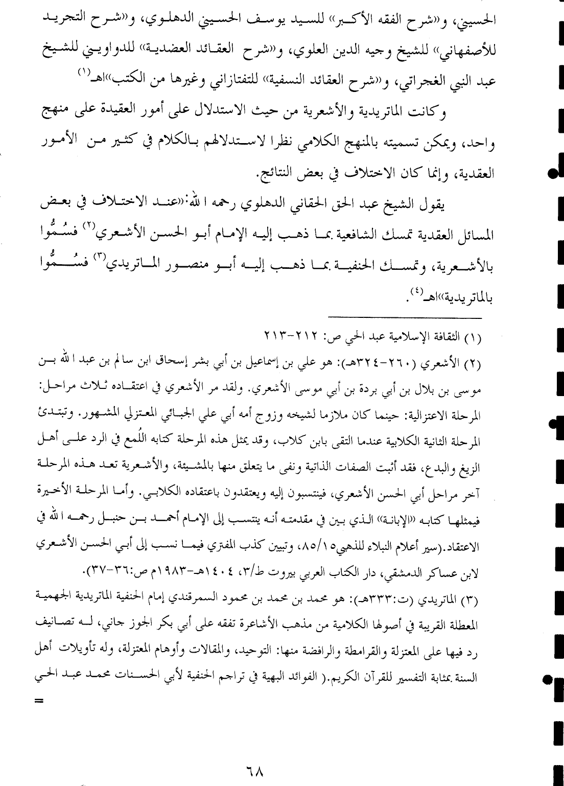 يقول الشيخ عبد الحق الحقاني الدهلوي رحمه الله: "عند الاختلاف في بعض المسائل العقدية تمسك الشافعية بما ذهب إليه الإمام أبو الحسن الأشعري (¬٢) فسُمُّوا بالأشعرية، وتمسك الحنفية بما ذهب إليه أبو منصور الماتريدي (¬٣) فسُمُّوا بالماتريدية" اهـ (¬٤).