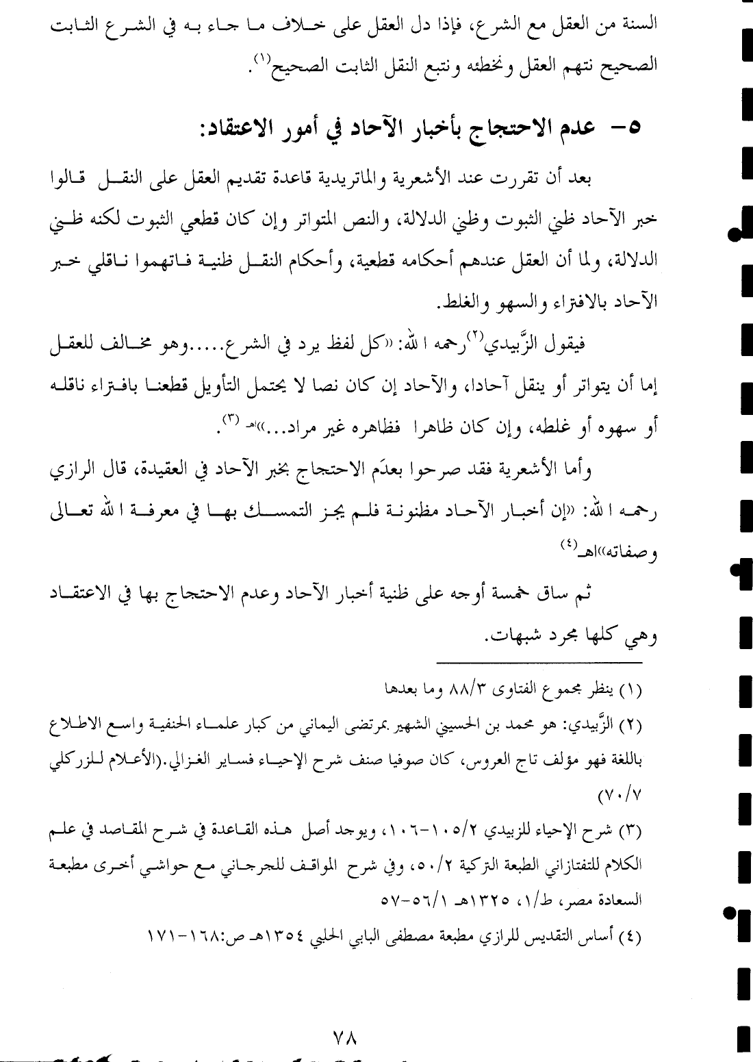 فيقول الزَّبيدي (¬٢) رحمه الله: "كل لفظ يرد في الشرع ..... وهو مخالف للعقل إما أن يتواتر أو ينقل آحادا، والآحاد إن كان نصا لا يحتمل التأويل قطعنا بافتراء ناقله أو سهوه أو غلطه، وإن كان ظاهرا فظاهره غير مراد ... " اهـ (¬٣).