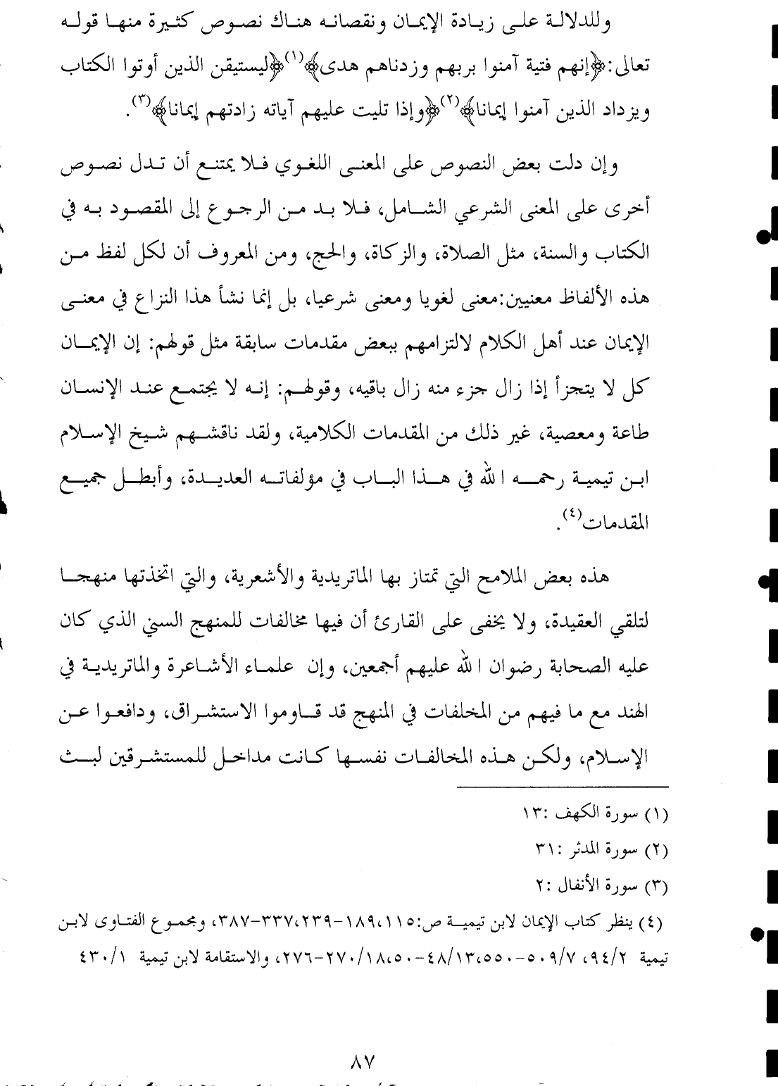 (¬٤) ينظر كتاب الإيمان لابن تيمية ص: ١١٥، ١٨٩ - ٣٣٧، ٢٣٩ - ٣٨٧، ومجموع الفتاوى لابن تيمية ٢/ ٩٤، ٧/ ٥٠٩ - ٥٥٠، ١٣/ ٤٨ - ٥٠، ١٨/ ٢٧٠ - ٢٧٦، والاستقامة لابن تيمية ١/ ٤٣٠.