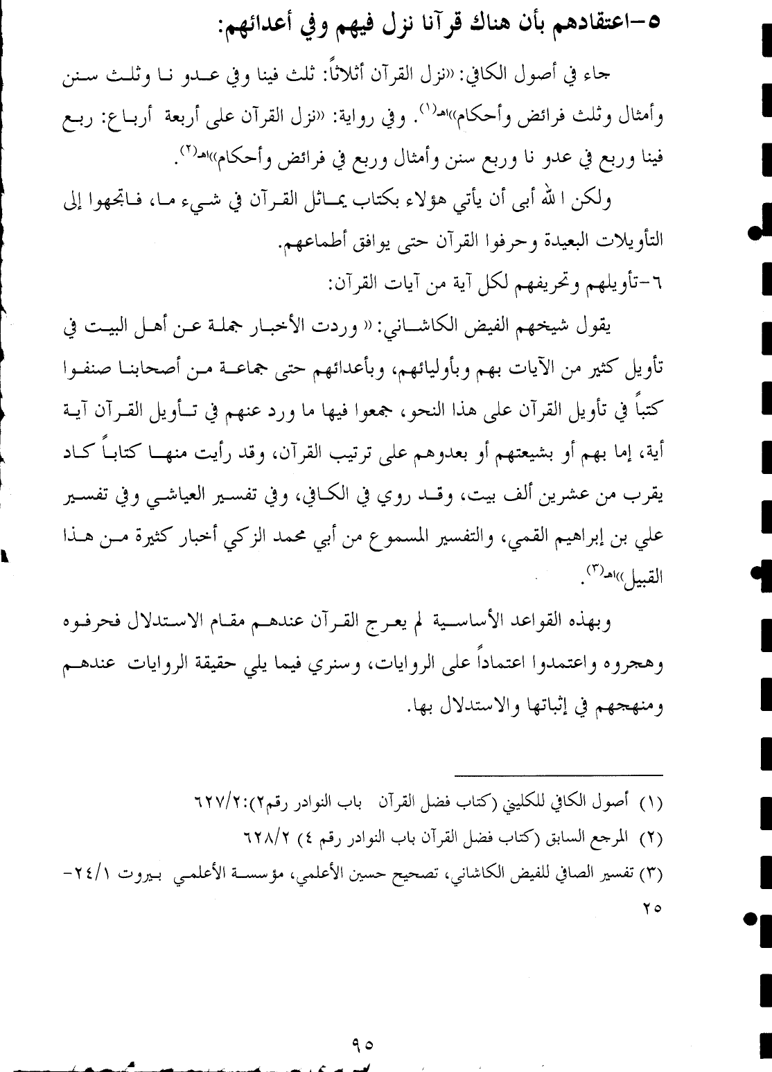 جاء في أصول الكافي: "نزل القرآن أثلاثًا: ثلث فينا وفي عدو نا وثلث سنن وأمثال وثلث فرائض وأحكام" اهـ (¬١). وفي رواية: "نزل القرآن على أربعة أرباع: ربع فينا وربع في عدونا وربع سنن وأمثال وربع في فرائض وأحكام" اهـ (¬٢).