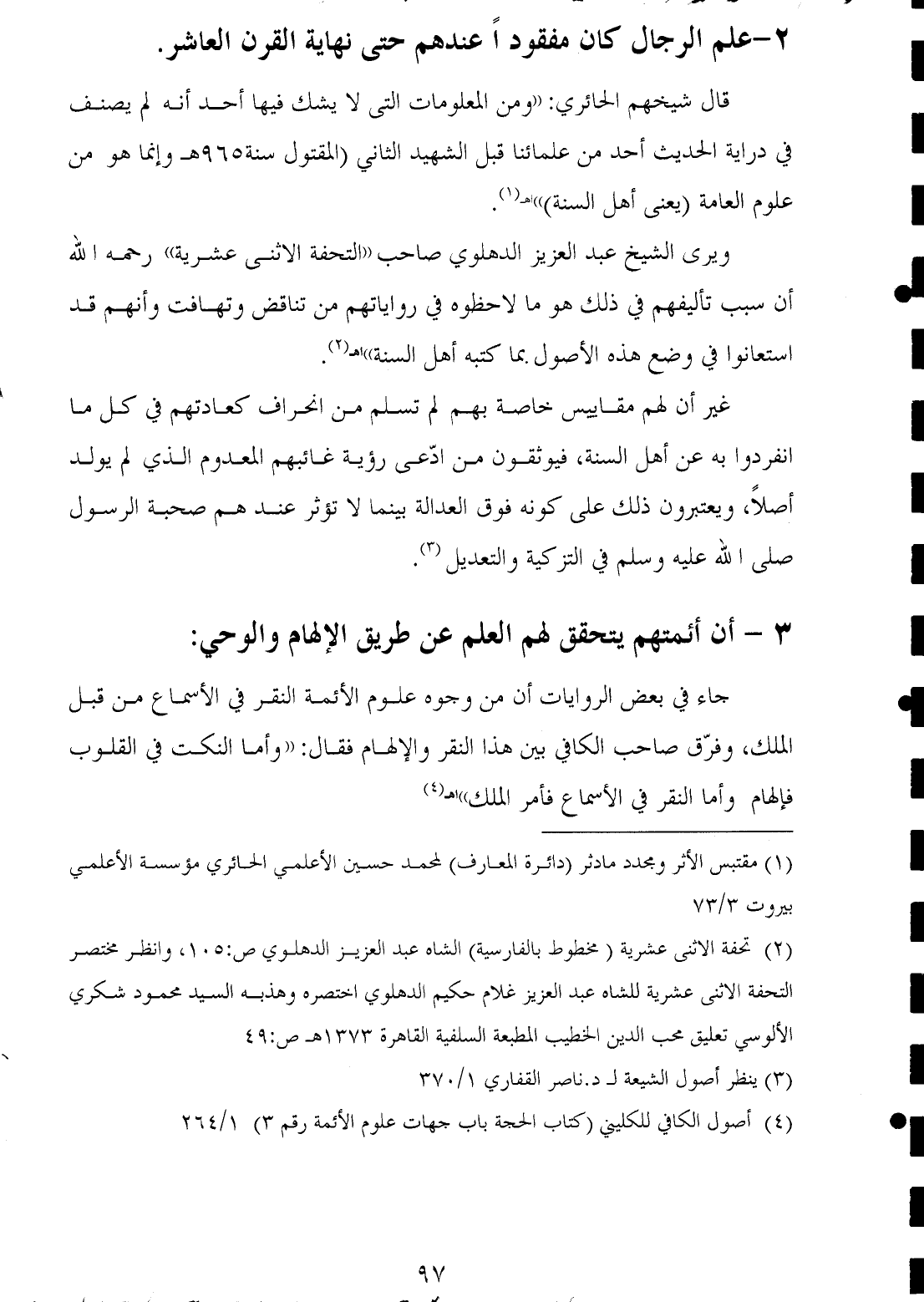 (¬٢) تحفة الاثنى عشرية (مخطوط بالفارسية) الشاه عبد العزيز الدهلوي ص: ١٠٥، وانظر مختصر التحفة الاثنى عشرية للشاه عبد العزيز غلام حكيم الدهلوي اختصره وهذبه السيد محمود شكري الألوسي تعليق محب الدين الخطيب المطبعة السلفية القاهرة ١٣٧٣ هـ ص: ٤٩.