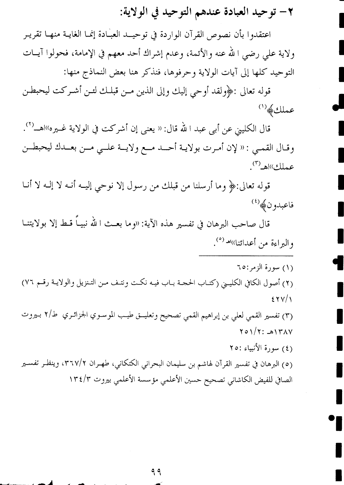 اعتقدوا بأن نصوص القرآن الواردة في توحيد العبادة إنما الغاية منها تقرير ولاية علي رضي الله عنه والأئمة، وعدم إشراك أحد معهم في الإمامة، فحولوا آيات التوحيد كلها إلى آيات الولاية وحرفوها، فنذكر هنا بعض النماذج منها: قوله تعالى: {وَلَقَدْ أُوحِيَ إِلَيْكَ وَإِلَى الَّذِينَ مِنْ قَبْلِكَ لَئِنْ أَشْرَكْتَ لَيَحْبَطَنَّ عَمَلُكَ} (¬١).