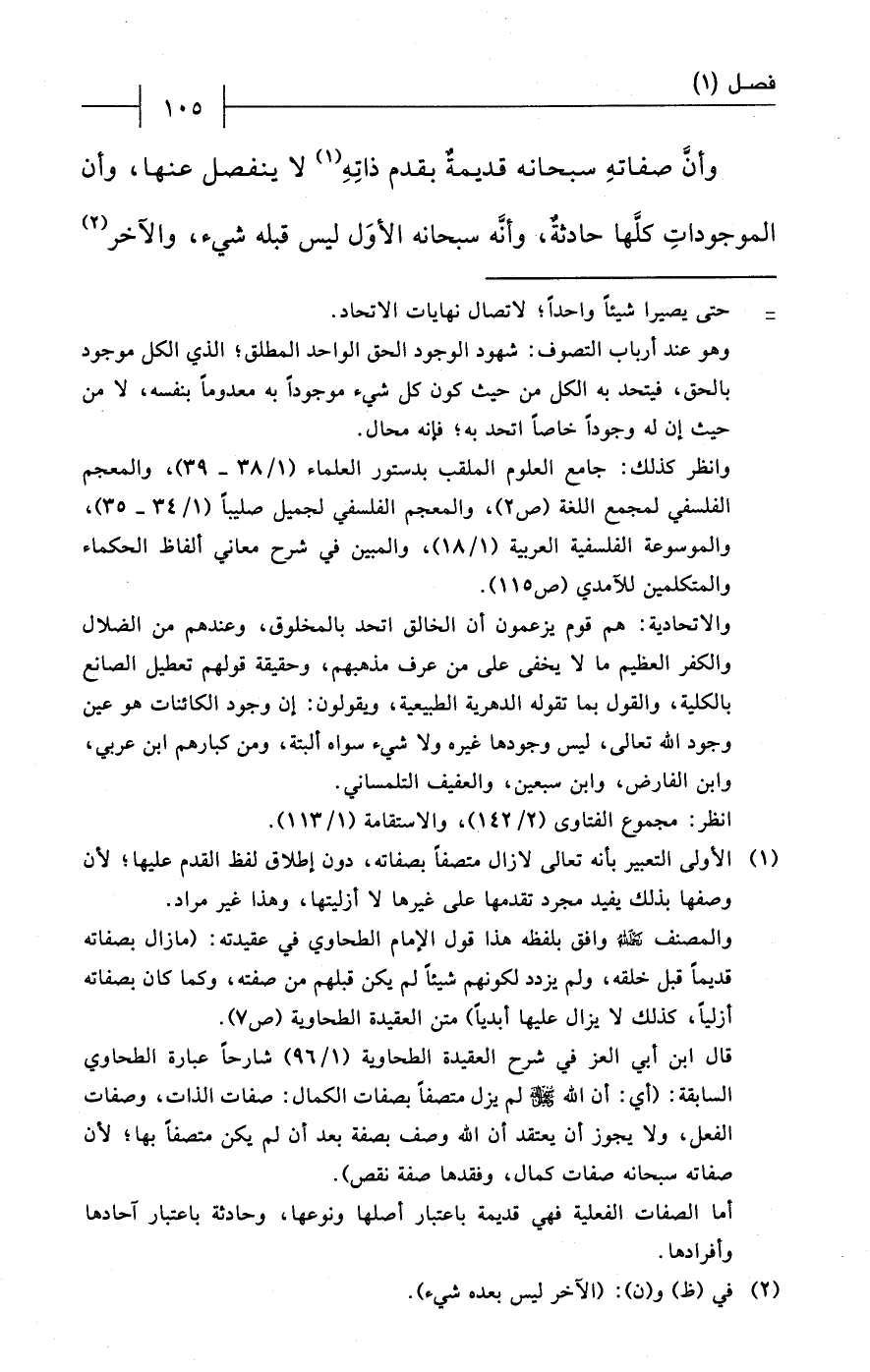 (¬1) الأولى التعبير بأنه تعالى لا زال متصفاً بصفاته، دون إطلاق لفظ القدم عليها؛ لأن وصفها بذلك يفيد مجرد تقدمها على غيرها لا أزليتها، وهذا غير مراد.