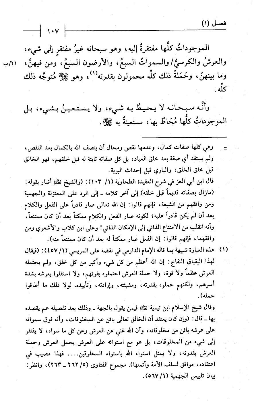 (¬1) هذه العبارة شبيهة بما قاله الإمام الدارمي في نقضه على المريسي (1/ 457): (فيقال لهذا البقباق النفاج: إن الله أعظم من كل شيء وأكبر من كل خلق، ولم يحتمله العرش عظماً ولا قوة، ولا حملة العرش احتملوه بقوتهم، ولا استقلوا بعرشه بشدة أسرهم، ولكنهم حملوه بقدرته، ومشيئته، وإرادته، وتأييده. لولا ذلك ما أطاقوا حمله).