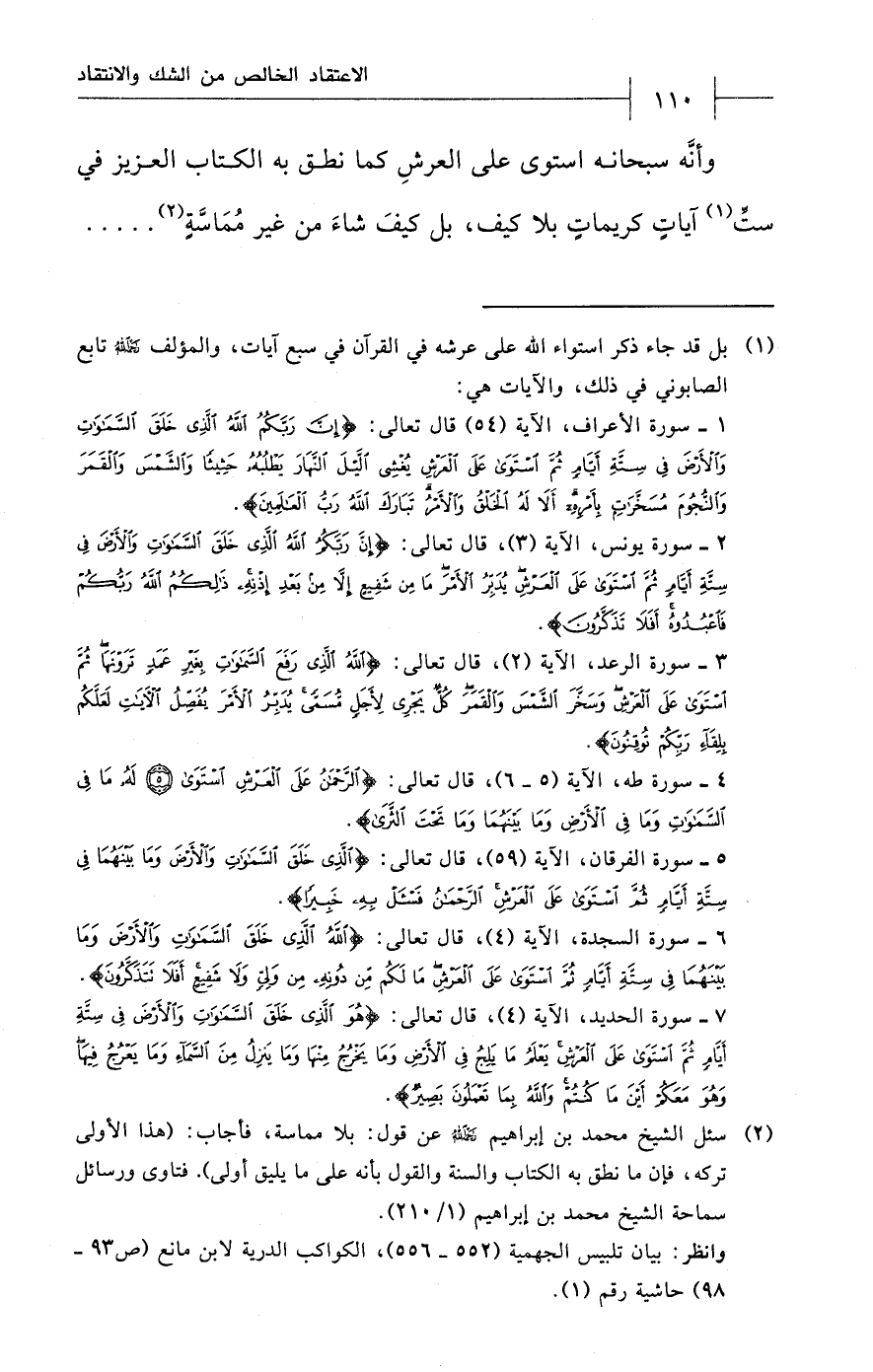 (¬2) سئل الشيخ محمّد بن إبراهيم - رحمه الله - عن قول: بلا مماسة، فأجاب: (هذا الأولى تركه، فإن ما نطق به الكتاب والسنة والقول بأنه على ما يليق أولى). فتاوى ورسائل سماحة الشيخ محمّد بن إبراهيم (1/ 210).