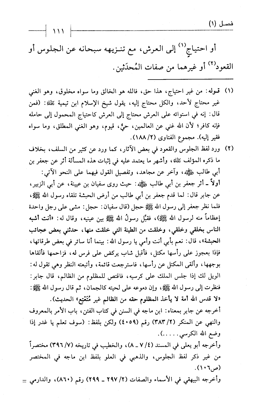 (¬2) ورد لفظ الجلوس والقعود في بعض الآثار، كما ورد عن كثير من السلف، بخلاف ما ذكره المؤلف - رحمه الله - وأشهر ما يعتمد عليه في إثبات هذه المسألة أثر عن جعفر بن أبي طالب - رضي الله عنه -، وآخر عن مجاهد، وتفصيل القول فيهما على النحو الآتي: