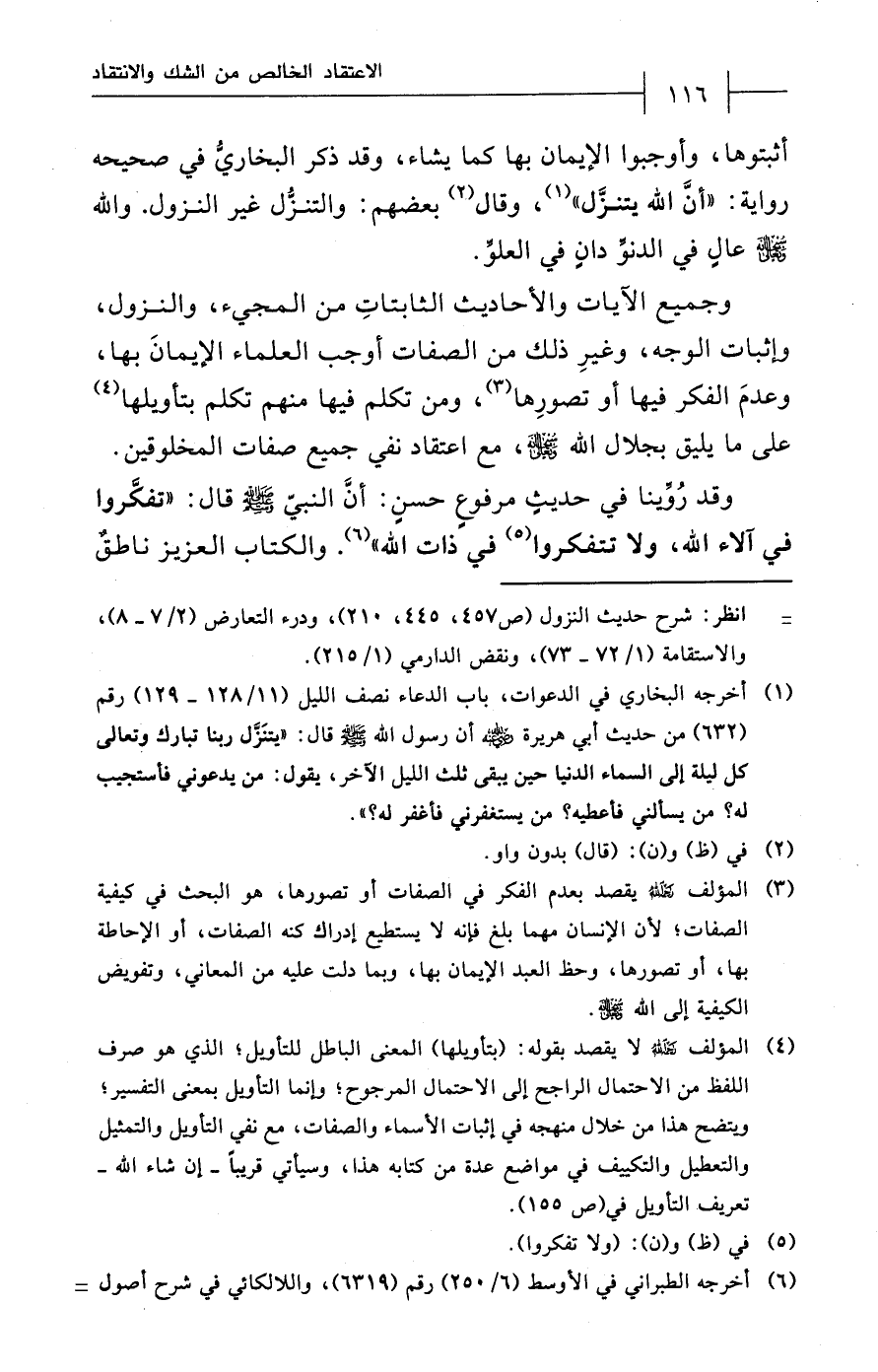 وجميع الآيات والأحاديث الثابتاتِ من المجيء، والنزول، وإثبات الوجه، وغيرِ ذلك من الصفات أوجب العلماء الإيمانَ بها، وعدمَ الفكر فيها أو تصورِها (¬3)، ومن تكلم فيها منهم تكلم بتأويلها (¬4) على ما يليق بجلال الله - سبحانه وتعالى -، مع اعتقاد نفي جميع صفات المخلوقين.