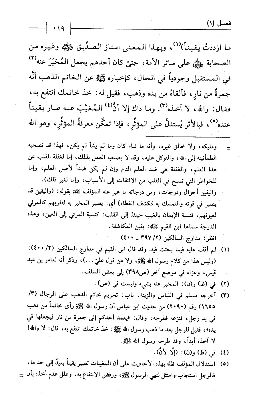 ما ازددتُ يقيناً) (¬1)، وبهذا المعنى امتاز الصدِّيق - رضي الله عنه - وغيره من الصحابة - رضي الله عنهم - على سائر الأمة، حتىّ كان أحدهم يجعل المُخبَرَ عنه (¬2) في المستقبل وجودياً في الحال، كإخباره - صلى الله عليه وسلم - عن الخاتم الذهب أنَّه جمرةٌ من نارٍ، فألقاهُ من يده وذهب، فقيل له: خذ خاتمك انتفع به، فقال: والله، لا آخذه (¬3). وما ذاك إلا أنَّ (¬4) المُغيَّبَ عنه صار يقيناً عنده (¬5)، فبالأثر يُستدلُّ على المؤثِّرِ، فإذا تمكَّن معرفةُ المؤثِّرِ، وهو الله