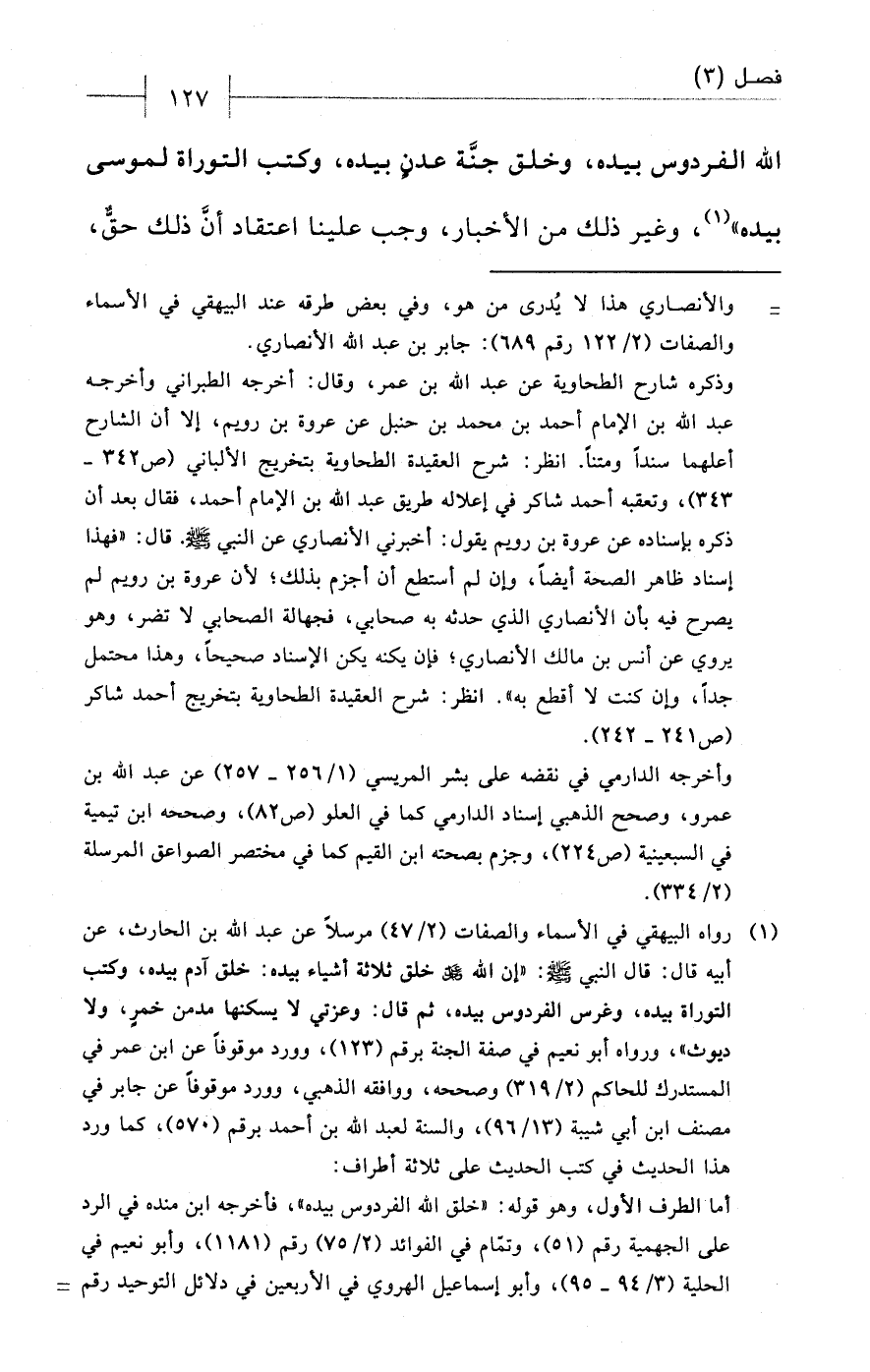 (¬1) رواه البيهقي في الأسماء والصفات (2/ 47) مرسلاً عن عبد الله بن الحارث، عن أبيه قال: قال النبي - صلى الله عليه وسلم -: "إن الله - عز وجل - خلق ثلاثة أشياء بيده: خلق آدم بيده، وكتب التوراة بيده، وغرس الفردوس بيده، ثم قال: وعزتي لا يسكنها مدمن خمرٍ، ولا ديوث"، ورواه أبو نعيم في صفة الجنة برقم (123)، وورد موقوفاً عن ابن عمر في المستدرك للحاكم (2/ 319) وصححه، ووافقه الذهبي، وورد موقوفاً عن جابر في مصنف ابن أبي شيبة (13/ 96)، والسنة لعبد الله بن أحمد برقم (570)، كما ورد هذا الحديث في كتب الحديث على ثلاثة أطراف: