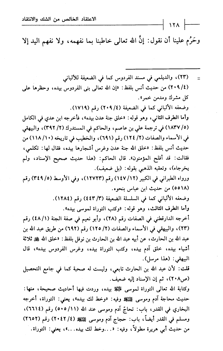 وحَرُم علينا أن نقول: إنَّ الله تعالى خاطبنا بما نفهمه، ولا نفهم اليد إلا