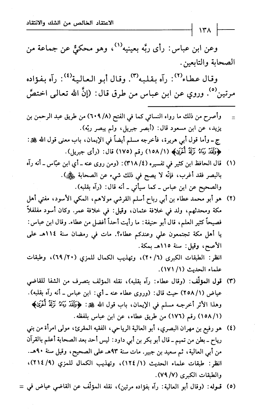 (¬1) قال الحافظ ابن كثير في تفسيره (4/ 318): (ومن روى عنه - أي ابن عبَّاس - أنه رآه بالبصر فقد أغرب، فإنّه لا يصح في ذلك شيء عن الصّحابة - رضي الله عنهم -).