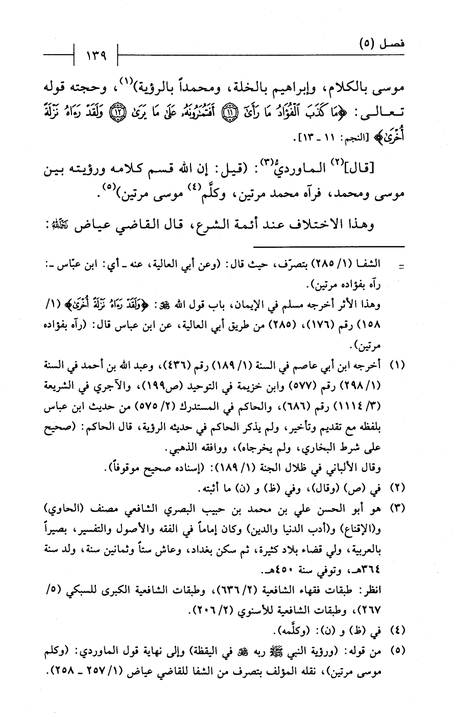 (¬5) من قوله: (ورؤية النّبيّ - صلى الله عليه وسلم - ربه - عز وجل - في اليقظة) وإلى نهاية قول الماوردي: (وكلم موسى مرتين)، نقله المؤلف بتصرف من الشفا للقاضي عياض (1/ 257 - 258).