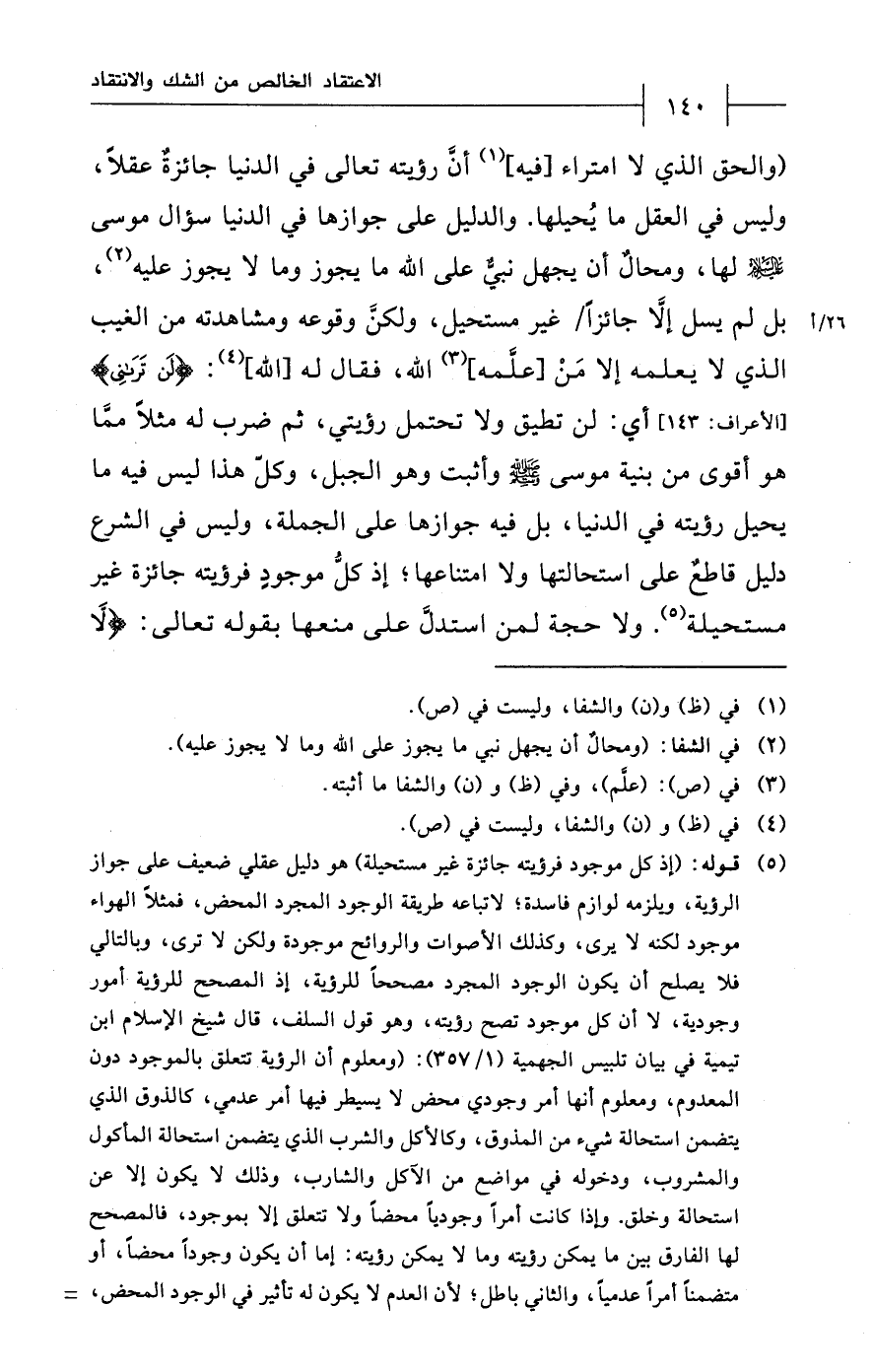 (¬5) قوله: (إذ كل موجود فرؤيته جائزة غير مستحيلة) هو دليل عقلي ضعيف على جواز الرؤية، ويلزمه لوازم فاسدة؛ لاتباعه طريقة الوجود المجرد المحض، فمثلًا الهواء موجود لكنه لا يرى، وكذلك الأصوات والروائح موجودة ولكن لا ترى، وبالتالي فلا يصلح أن يكون الوجود المجرد مصححاً للرؤية، إذ المصحح للرؤية أمور وجودية، لا أن لكل موجود تصح رؤيته، وهو قول السلف، قال شيخ الإسلام ابن تيمية في بيان تلبيس الجهمية (1/ 357): (ومعلوم أن الرؤية تتعلق بالموجود دون المعدوم، ومعلوم أما أمر وجودي محض لا يسيطر فيها أمر عدمي، كالذوق الذي يتضمن استحالة شيء من المذوق، وكالأكل والشرب الذي يتضمن استحالة المأكول والمشروب، ودخوله في مواضع من الآكل والشارب، وذلك لا يكون إلا عن استحالة وخلق. وإذا كانت أمراً وجودياً محضاً ولا تتعلّق إِلَّا بموجود، فالمصحح لها الفارق بين ما يمكن رؤيته وما لا يمكن رؤيته: إمّا أن يكون وجوداً محضاً، أو متضمناً أمراً عدمياً، والثّاني باطل؛ لأن العدم لا يكون له تأثير في الوجود المحض، =