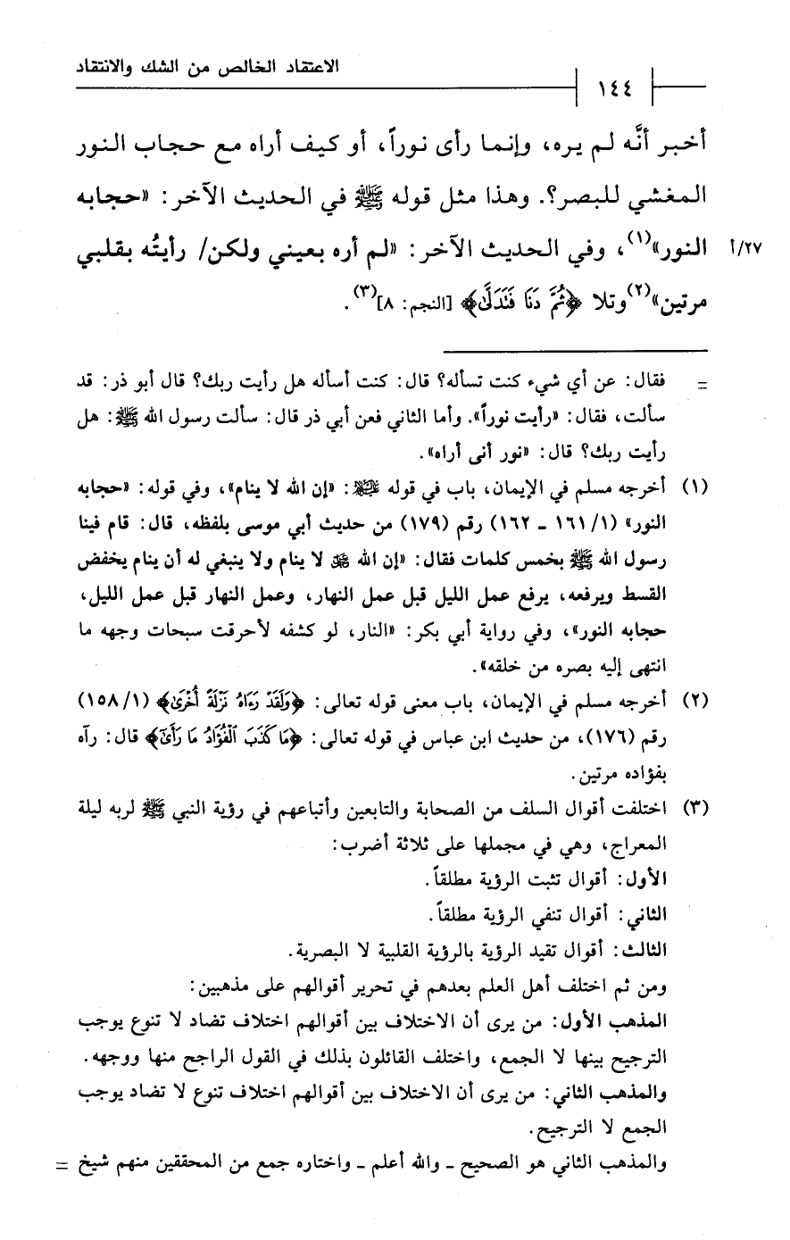 = فقال: عن أي شيء كنت تسأله؟ قال: كنت أسأله هل رأيت ربك؟ قال أبو ذر: قد سألت، فقال: "رأيت نوراً". وأما الثّاني فعن أبي ذر قال: سألت رسول الله - صلى الله عليه وسلم -: هل رأيت ربك؟ قال: "نور أنى أراه".