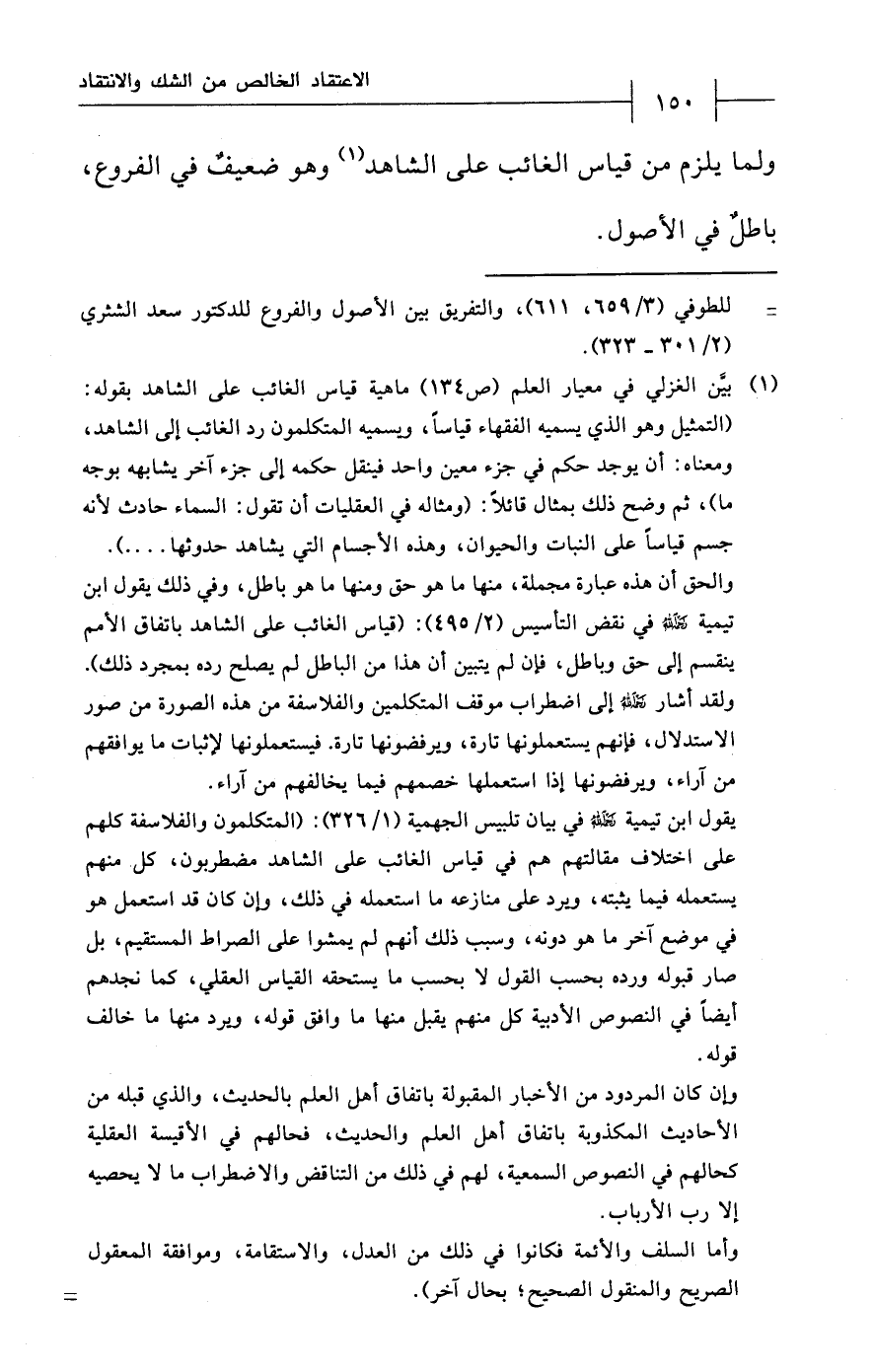 يقول ابن تيمية - رحمه الله - في بيان تلبيس الجهمية (1/ 326): (المتكلمون والفلاسفة كلهم على اختلاف مقالتهم هم في قياس الغائب على الشاهد مضطربون، كل منهم يستعمله فيما يثبته، ويرد على منازعه ما استعمله في ذلك، وإن كان قد استعمل هو في موضع آخر ما هو دونه، وسبب ذلك أنهم لم يمشوا على الصراط المستقيم، بل صار قبوله ورده بحسب القول لا بحسب ما يستحقه القياس العقلي، كما نجدهم أيضاً في النصوص الأدبية كل منهم يقبل منها ما وافق قوله، ويرد منها ما خالف قوله.