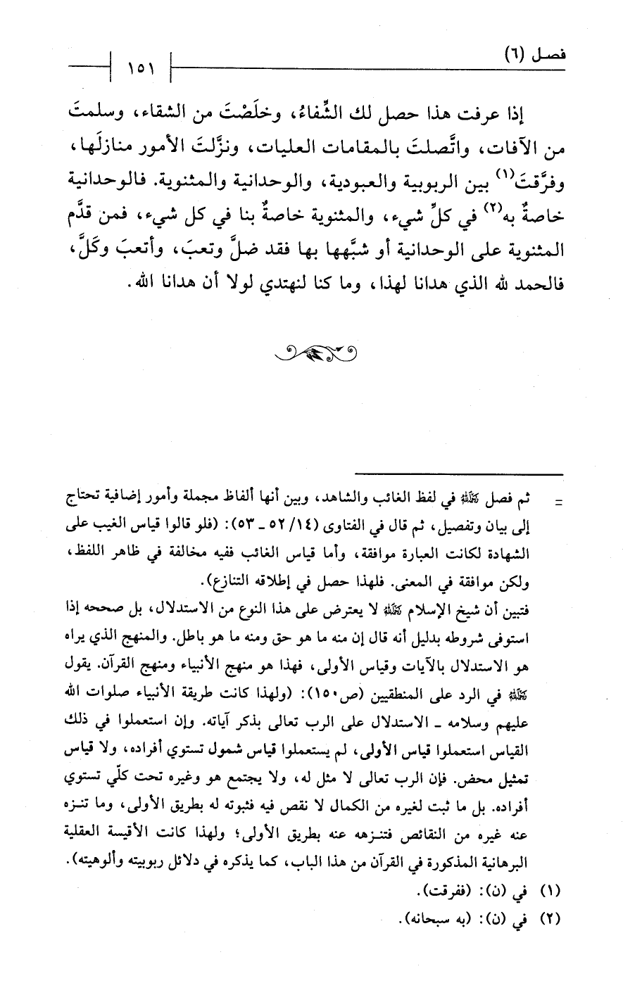 إذا عرفت هذا حصل لك الشِّفاءُ، وخلَصْتَ من الشقاء، وسلمتَ من الآفات، واتَّصلتَ بالمقامات العليات، ونزَّلتَ الأمور منازلَها، وفَرَّقتَ (¬1) بين الربوبية والعبودية، والوحدانية والمثنوية. فالوحدانيّة خاصّةٌ به (¬2) في كلِّ شيء، والمثنوية خاصّةٌ بنا في كل شيء، فمن قدَّم المثنوية على الوحدانية أو شبَّهها بها فقد ضلَّ وتعبَ، وأتعبَ وكَلَّ، فالحمد لله الذي هدانا لهذا، وما كنا لنهتدي لولا أن هدانا الله.