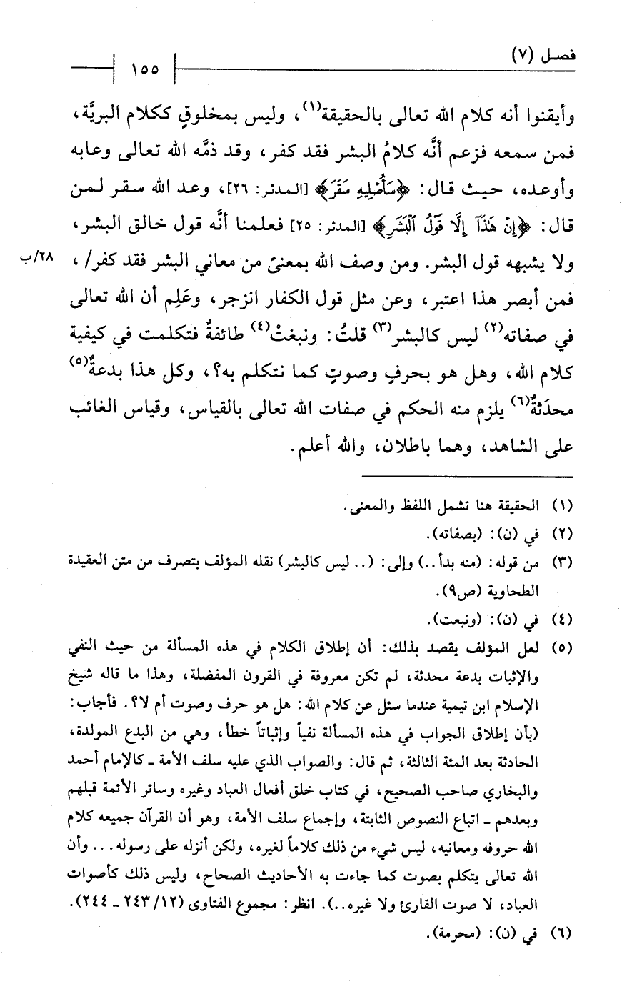 (¬5) لعلّ المؤلف يقصد بذلك: أن إطلاق الكلام في هذه المسألةُ من حيث النَّفْي والإثبات بدعة محدثة، لم تكن معروفة في القرون المفضلة، وهذا ما قاله شيخ الإسلام ابن تيمية عندما سئل عن كلام الله: هل هو حرف وصوت أم لا؟. فأجاب: (بأن إطلاق الجواب في هذه المسألة نفياً وإثباتاً خطأ، وهي من البدع المولدة، الحادثة بعد المئة الثّالثة، ثم قال: والصواب الذي عليه سلف الأمة - كالإمام أحمد والبخاري صاحب الصّحيح، في كتاب خلق أفعال العباد وغيره وسائر الأئمة قبلهم وبعدهم - اتباع النصوص الثابتة، وإجماع سلف الأمة، وهو أن القرآن جميعه كلام الله حروفه ومعانيه، ليس شيء من ذلك كلاماً لغيره، ولكن أنزله على رسوله ... وأن الله تعالى يتكلم بصوت كما جاءت به الأحاديث الصحاح، وليس ذلك كأصوات العباد، لا صوت القارئ ولا غيره ...). انظر: مجموع الفتاوى (12/ 243 - 244).