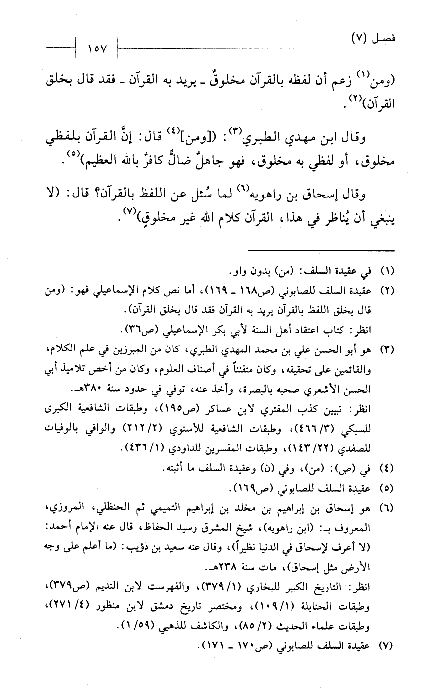 (¬2) عقيدة السلف للصابوني (ص 168 - 169)، أما نص كلام الإسماعيلي فهو: (ومن قال بخلق اللّفظ بالقرآن يريد به القرآن فقد قال بخلق القرآن).