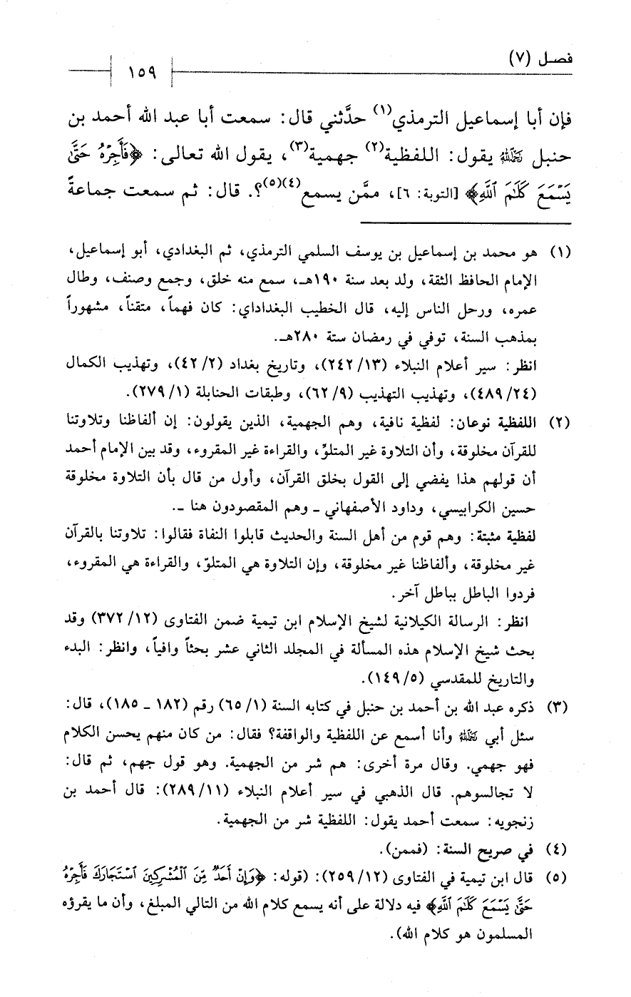 (¬5) قال ابن تيمية في الفتاوى (12/ 259): (قوله: {وَإِنْ أَحَدٌ مِنَ الْمُشْرِكِينَ اسْتَجَارَكَ فَأَجِرْهُ حَتَّى يَسْمَعَ كَلَامَ اللَّهِ} فيه دلالة على أنه يسمع كلام الله من التالي المبلغ، وأن ما يقرؤه المسلمون هو كلام الله).