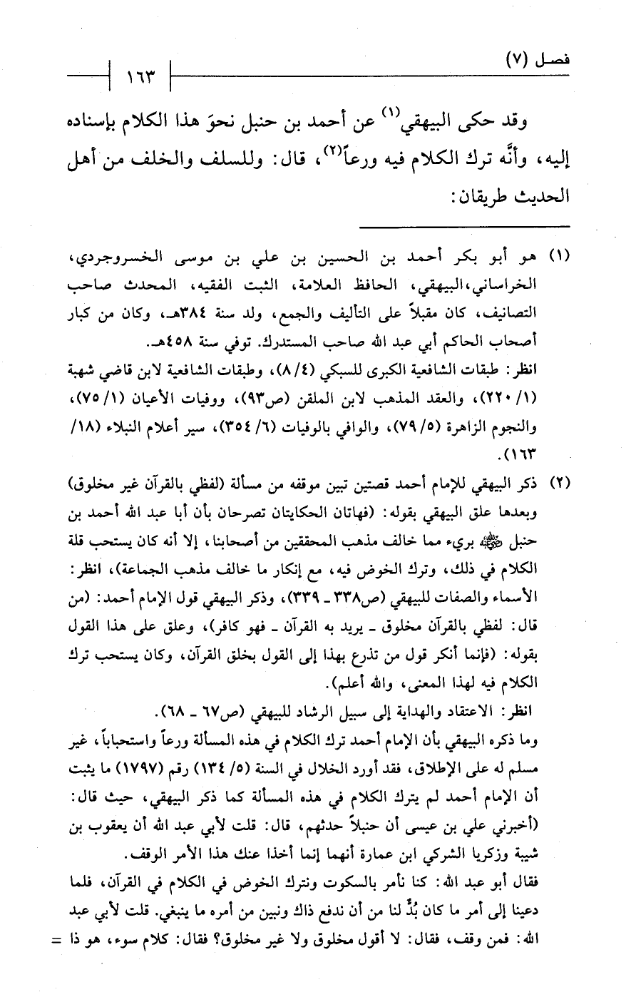 (¬2) ذكر البيهقي للإمام أحمد قصتين تبين موقفه من مسألة (لفظي بالقرآن غير مخلوق) وبعدها علّق البيهقي بقوله: (فهاتان الحكايتان تصرحان بأن أبا عبد الله أحمد بن حنبل - رضي الله عنه - بريء ممّا خالف مذهب المحققين من أصحابنا، إلا أنه كان يستحب قلة الكلام في ذلك، وترك الخوض فيه، مع إنكار ما خالف مذهب الجماعة)، انظر: الأسماء والصفات للبيهقي (ص 338 - 339)، وذكر البيهقي قول الإمام أحمد: (من قال: لفظي بالقرآن مخلوق - يريد به القرآن - فهو كافر)، وعلق على هذا القول بقوله: (فإنما أنكر قول من تذرع بهذا إلى القول بخلق القرآن، وكان يستحب ترك الكلام فيه لهذا المعنى، والله أعلم).