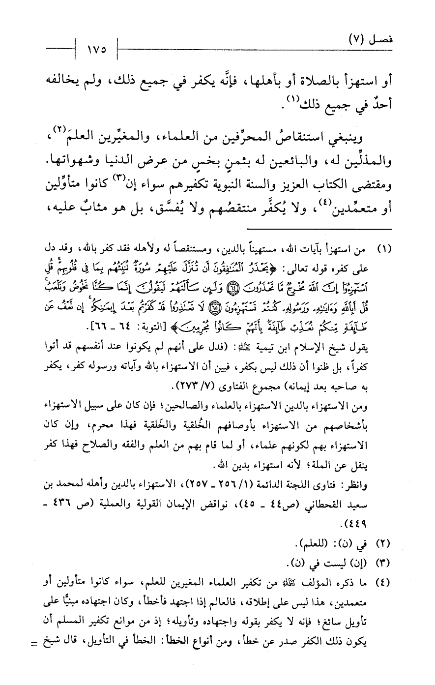 (¬4) ما ذكره المؤلف - رحمه الله - من تكفير العلماء المغيرين للعلم، سواء كانوا متأولين أو متعمدين، هذا ليس على إطلاقه، فالعالم إذا اجتهد فأخطأ، وكان اجتهاده مبنيًّا على تأويل سائغ؛ فإنّه لا يكفر بقوله واجتهاده وتأويله؛ إذ من موانع تكفير المسلم أن يكون ذلك الكفر صدر عن خطأ، ومن أنواع الخطأ: الخطأ في التأويل، قال شيخ =