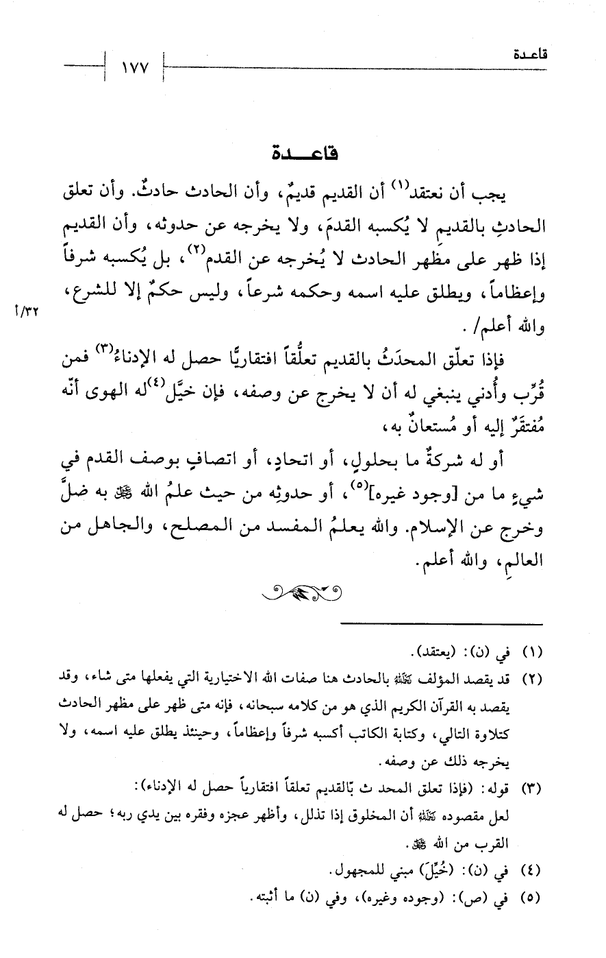 يجب أن نعتقد (¬1) أن القديم قديمٌ، وأن الحادث حادثٌ. وأن تعلّق الحادثِ بالقديمِ لا يُكسبه القدمَ، ولا يخرجه عن حدوثه، وأن القديم إذا ظهر على مظهر الحادث لا يُخرجه عن القدم (¬2)، بل يُكسبه شرفاً وإعظاماً، ويطلق عليه اسمه وحكمه شرعاً، وليس حكمٌ إلا للشرع، والله أعلم.