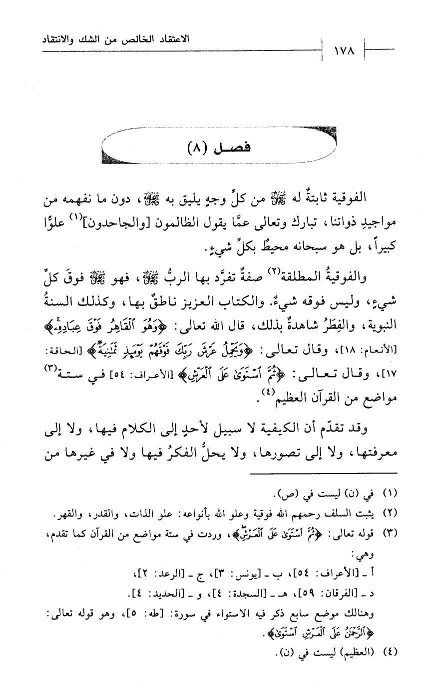 والفوقيةُ المطلقة (¬2) صفةٌ تفرَّد بها الربُّ - سبحانه وتعالى -، فهو - سبحانه وتعالى - فوقَ كلِّ شيءٍ، وليس فوقه شيءٌ. والكتاب العزيز ناطقٌ بها، وكذلك السنة النبوية، والفِطَرُ شاهدةٌ بذلك، قال الله تعالى: {وَهُوَ الْقَاهِرُ فَوْقَ عِبَادِهِ} [الأنعام: 18]، وقال تعالى: {وَيَحْمِلُ عَرْشَ رَبِّكَ فَوْقَهُمْ يَوْمَئِذٍ ثَمَانِيَةٌ} [الحاقة: 17]، وقال تعالى: {ثُمَّ اسْتَوَى عَلَى الْعَرْشِ} [الأعراف: 54]، في ستة (¬3) مواضع من القرآن العظيم (¬4).