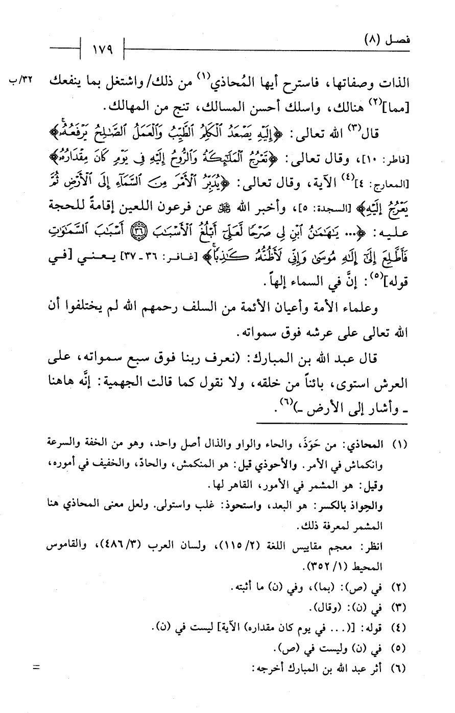قال عبد الله بن المبارك: (نعرف ربنا فوق سبع سمواته، على العرش استوى، بائناً من خلقه، ولا نقول كما قالت الجهمية: إنَّه ها هنا - وأشار إلى الأرض -) (¬6).
