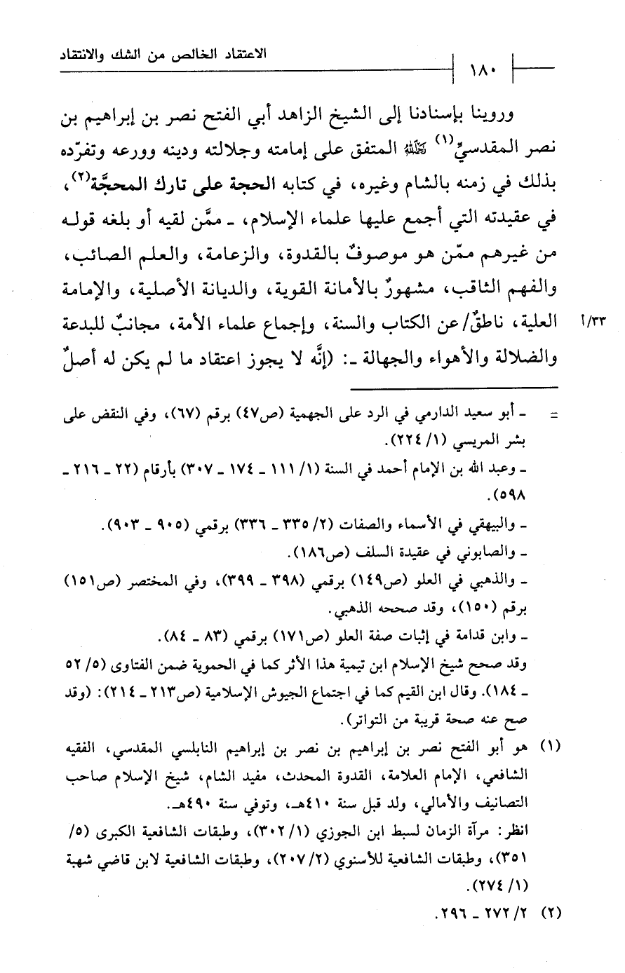 (¬1) هو أبو الفتح نصر بن إبراهيم بن نصر بن إبراهيم النابلسي المقدسي، الفقيه الشّافعيّ، الإمام العلّامة، القدوة المحدث، مفيد الشّام، شيخ الإسلام صاحب التصانيف والأمالي، ولد قبل سنة 410 هـ، وتوفي سنة 490 هـ.