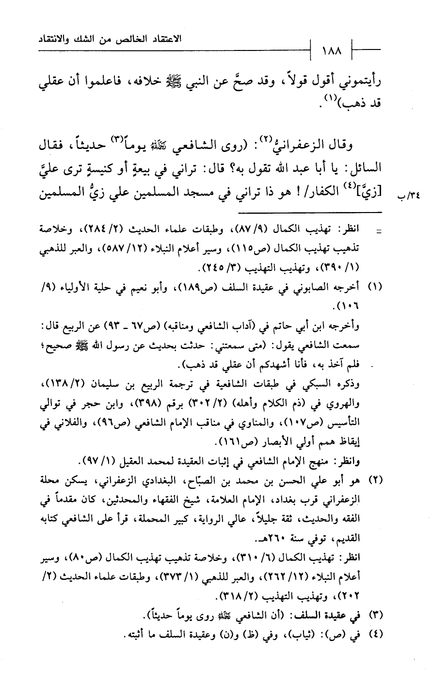 وقال الزعفرانيُّ (¬2): (روى الشّافعيّ - رحمه الله - يوماً (¬3) حديثاً، فقال السائل: يا أبا عبد الله تقول به؟ قال: تراني في بيعةٍ أو كنيسةٍ ترى عليَّ [زيَّ] (¬4) الكفار! هو ذا تراني في مسجد المسلمين علي زيُّ المسلمين