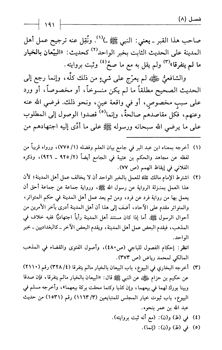 صاحب هذا القبر - يعني: النّبيّ - صلى الله عليه وسلم -) (¬1). ونُقِل عنه ترجيح عمل أهل المدينة على الحديث الثابت بخبر الواحد (¬2) كحديث: "البيّعان بالخيار ما لم يتفرقا" (¬3) ولم يقل به مع ما صحَّ (¬4) وثبت بروايته.