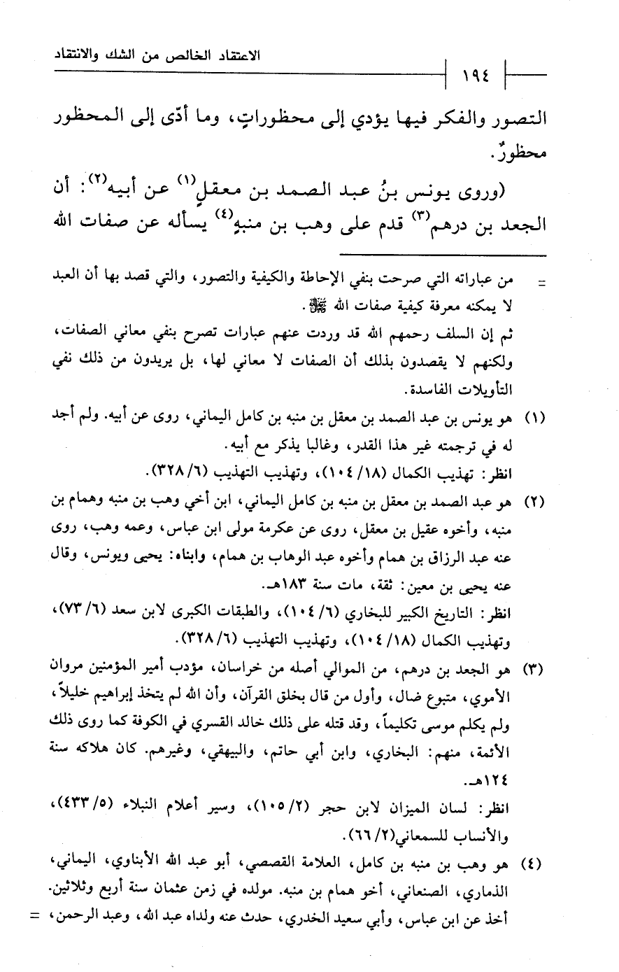 (¬3) هو الجعد بن درهم، من الموالي أصله من خراسان، مؤدب أمير المؤمنين مروان الأموي، متبوع ضال، وأول من قال بخلق القرآن، وأن الله لم يتخذ إبراهيم خليلًا، ولم يكلم موسى تكليماً، وقد قتله على ذلك خالد القسري في الكوفة كما روى ذلك الأئمة، منهم: البخاري، وابن أبي حاتم، والبيهقي، وغيرهم. كان هلاكه سنة 124 هـ.