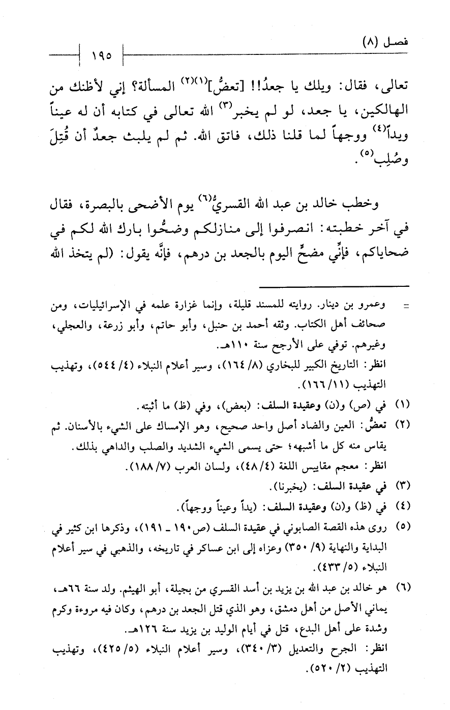 تعالى، فقال: ويلك يا جعدُ!! [تعضُّ] (¬1) (¬2) المسألة؟ إني لأظنك من الهالكين، يا جعد، لو لم يخبر (¬3) الله تعالى في كتابه أن له عيناً ويداً (¬4) ووجهاً لما قلنا ذلك، فاتق الله. ثم لم يلبث جعدٌ أن قُتِلَ وصُلِب (¬5).
