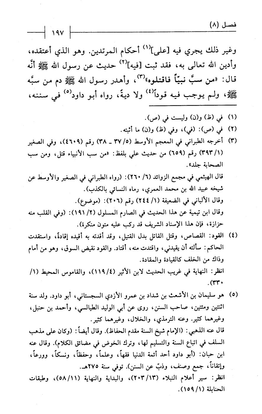 وغير ذلك يجري فيه [على] (¬1) أحكام المرتدين. وهو الذي أعتقده، وأدين الله تعالى به، فقد ثبت [فيه] (¬2) حديث عن رسول الله - صلى الله عليه وسلم - أنَّه قال: "من سبَّ نبيًّا فاقتلوه" (¬3)، وأهدر رسول الله - صلى الله عليه وسلم - دم من سبَّه - صلى الله عليه وسلم -، ولم يوجب فيه قوداً (¬4) ولا ديةً، رواه أبو داود (¬5) في سننه،