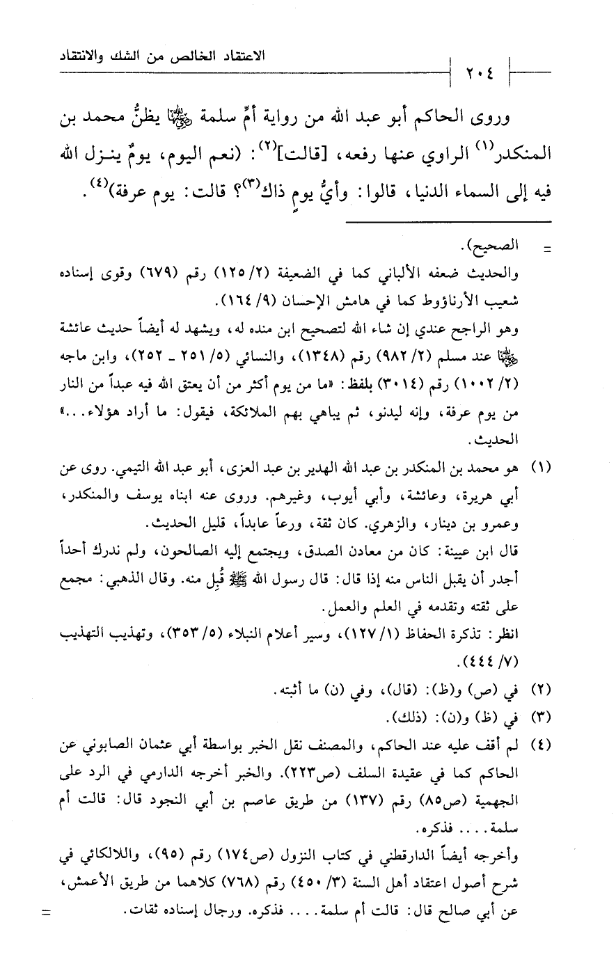 وهو الراجح عندي إن شاء الله لتصحيح ابن منده له، ويشهد له أيضاً حديث عائشة - رضي الله عنها - عند مسلم (2/ 982) رقم (1348)، والنسائي (5/ 251 - 252)، وابن ماجه (2/ 1002) رقم (3014) بلفظ: "ما من يوم أكثر من أن يعتق الله فيه عبداً من النار من يوم عرفة، وإنه ليدنو، ثم يباهي بهم الملائكة، فيقول: ما أراد هؤلاء ... " الحديث.