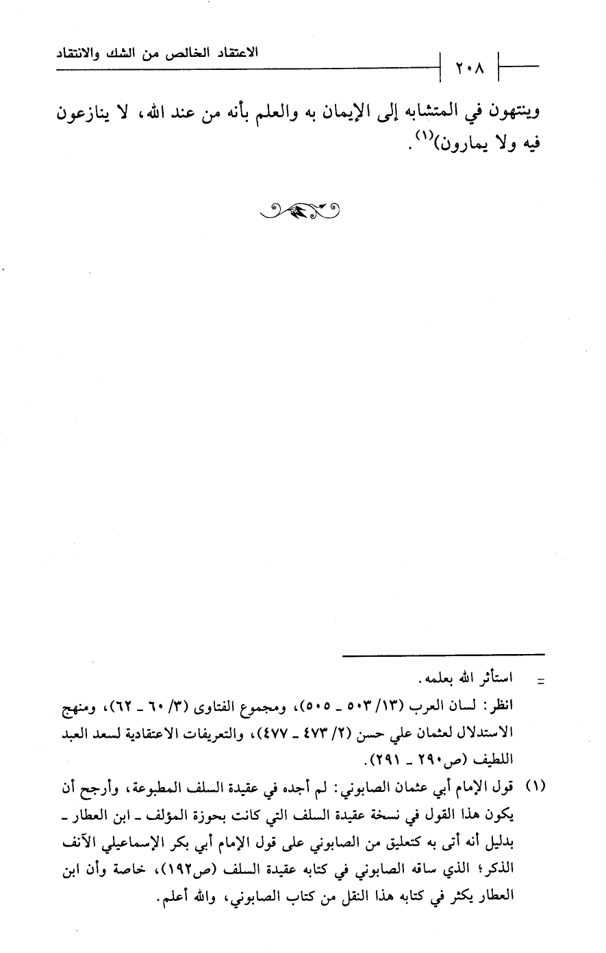 (¬1) قول الإمام أبي عثمان الصابوني: لم أجده في عقيدة السلف المطبوعة، وأرجح أن يكون هذا القول في نسخة عقيدة السلف التي كانت بحوزة المؤلف - ابن العطار - بدليل أنه أتى به كتعليق من الصابوني على قول الإمام أبي بكر الإسماعيلي الآنف الذكر؛ الذي ساقه الصابوني في كتابه عقيدة السلف (ص 192)، خاصة وأن ابن العطار يكثر في كتابه هذا النقل من كتاب الصابوني، والله أعلم.