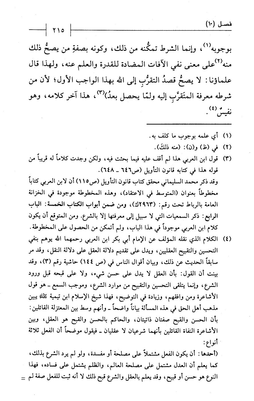 (¬4) الكلام الذي نقله المؤلف عن الإمام أبي بكر ابن العربي رحمهما الله يوهم بنفي التحسين والتقبيح العقليين، ويدل على تقديم دلالة العقل على دلالة النقل، وقد مر سابقاً الحديث عن ذلك، وبيان أقوال النَّاس في (ص 144) حاشية رقم (3)، وقد بينت أن القول: بأن العقل لا يدل على حسن شيء، ولا على قبحه قبل ورود الشرع، وإنّما يتلقى التحسين والتقبيح من موارد الشرع، وموجب السمع - هو قول الأشاعرة ومن وافقهم، وزيادة في التوضيح، فهذا شيخ الإسلام ابن تيمية - رحمه الله - يبين مذهب أهل الحق في هذه المسألةُ بياناً واضحاً - وأنهم وسط بين المعتزلة القائلين: بأن الحسن والقبح صفتان ذاتيتان، والحاكم بالحسن والقبح هو العقل، وبين الأشاعرة النفاة القائلين بأنهما شرعيان لا عقليان - فيقول موضحاً أن الفعل ثلاثة أنواع: