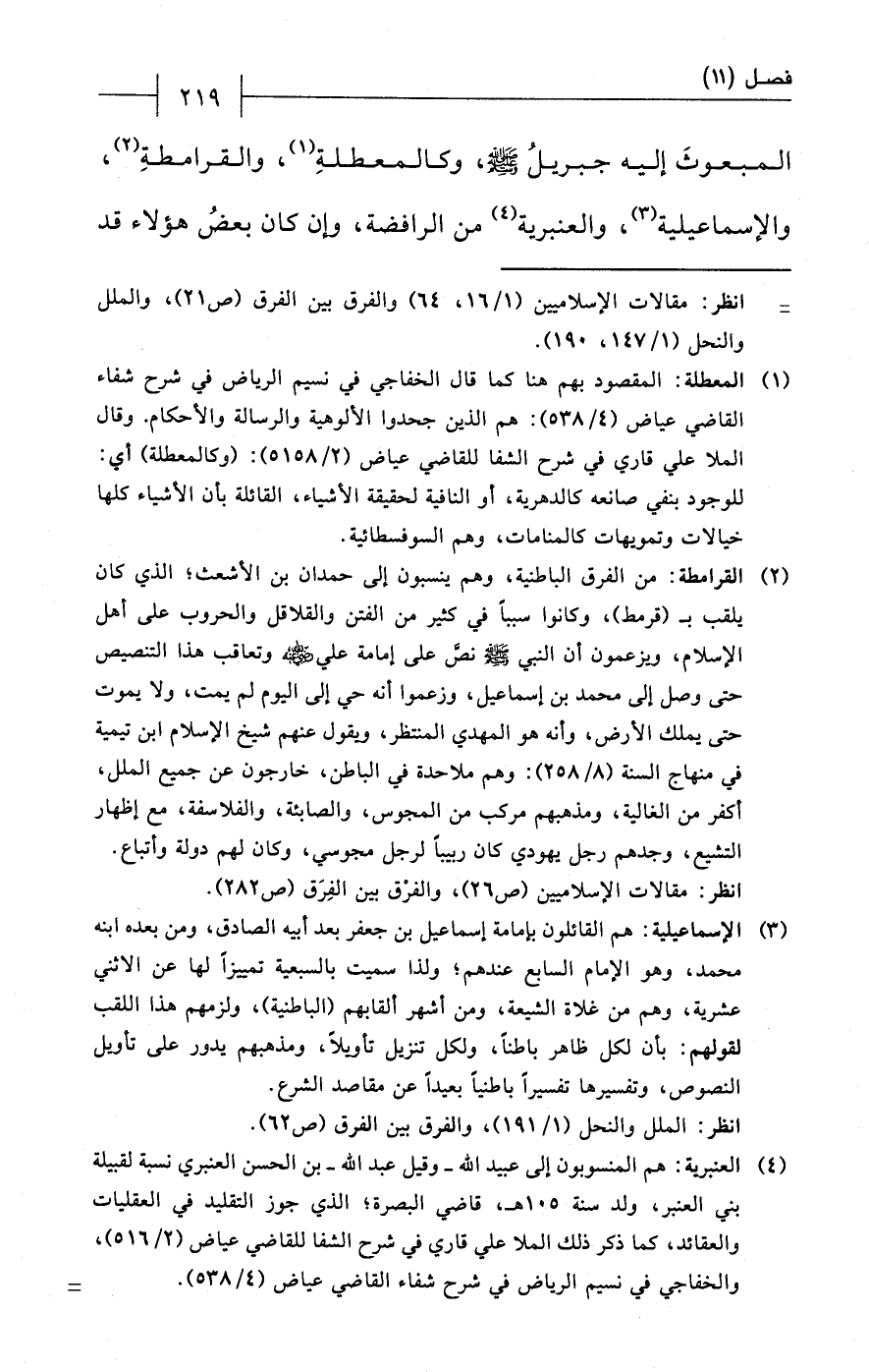 (¬1) المعطلة: المقصود بهم هنا كما قال الخفاجي في نسيم الرياض في شرح شفاء القاضي عياض (4/ 538): هم الذين جحدوا الألوهية والرسالة والأحكام. وقال الملا علي قاري في شرح الشفا للقاضي عياض (2/ 5158): (وكالمعطلة) أي: للوجود بنفي صانعه كالدهرية، أو النافية لحقيقة الأشياء، القائلة بأن الأشياء كلها خيالات وتمويهات كالمنامات، وهم السوفسطائية.