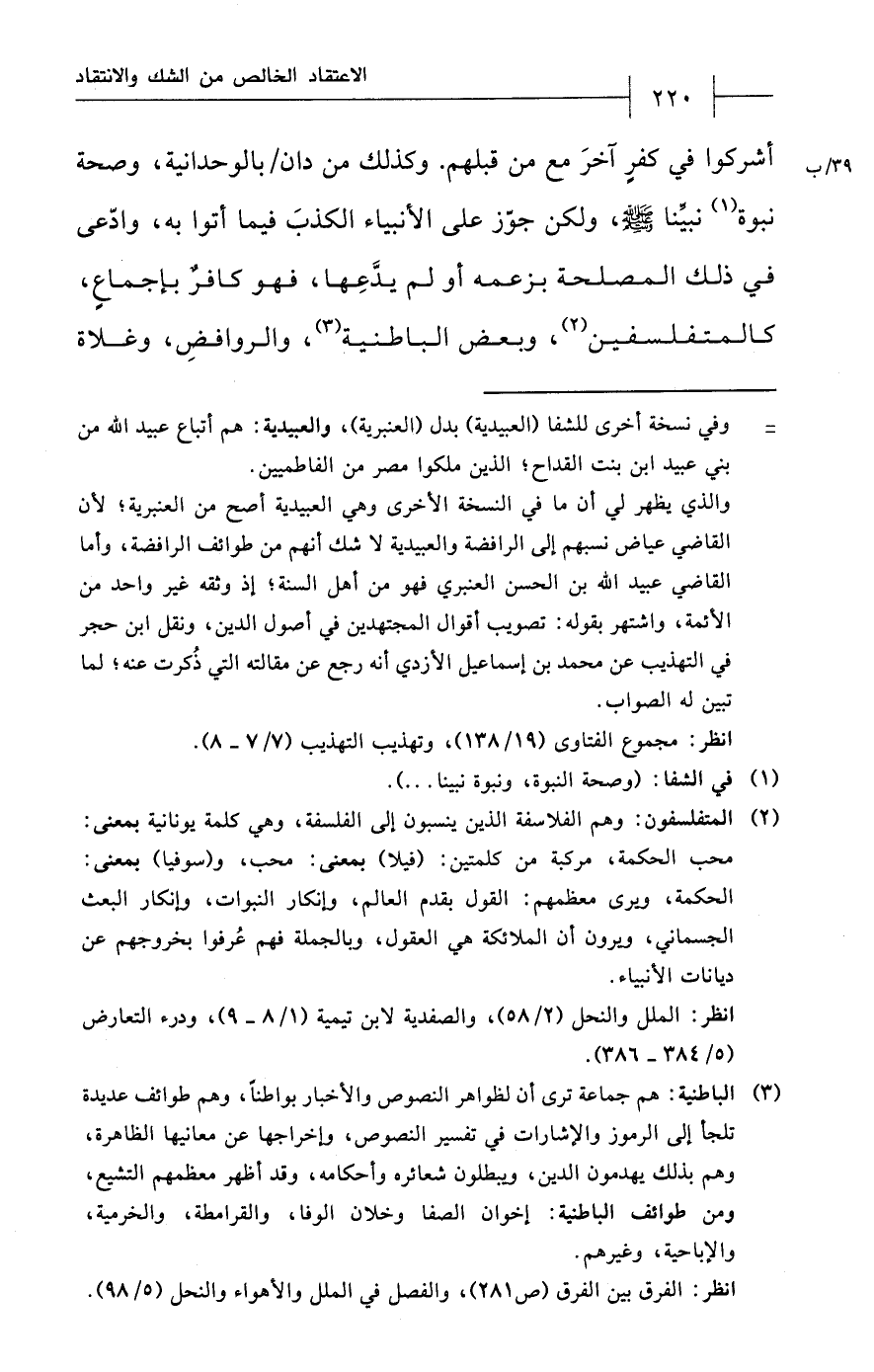 والذي يظهر لي أن ما في النسخة الأخرى وهي العبيدية أصح من العنبرية؛ لأن القاضي عياض نسبهم إلى الرافضة والعبيدية لا شك أنهم من طوائف الرافضة، وأما القاضي عبيد الله بن الحسن العنبري فهو من أهل السنة؛ إذ وثقه غير واحد من الأئمة، واشتهر بقوله: تصويب أقوال المجتهدين في أصول الدين، ونقل ابن حجر في التهذيب عن محمّد بن إسماعيل الأزدي أنه رجع عن مقالته التي ذُكرت عنه؛ لما تبين له الصواب.