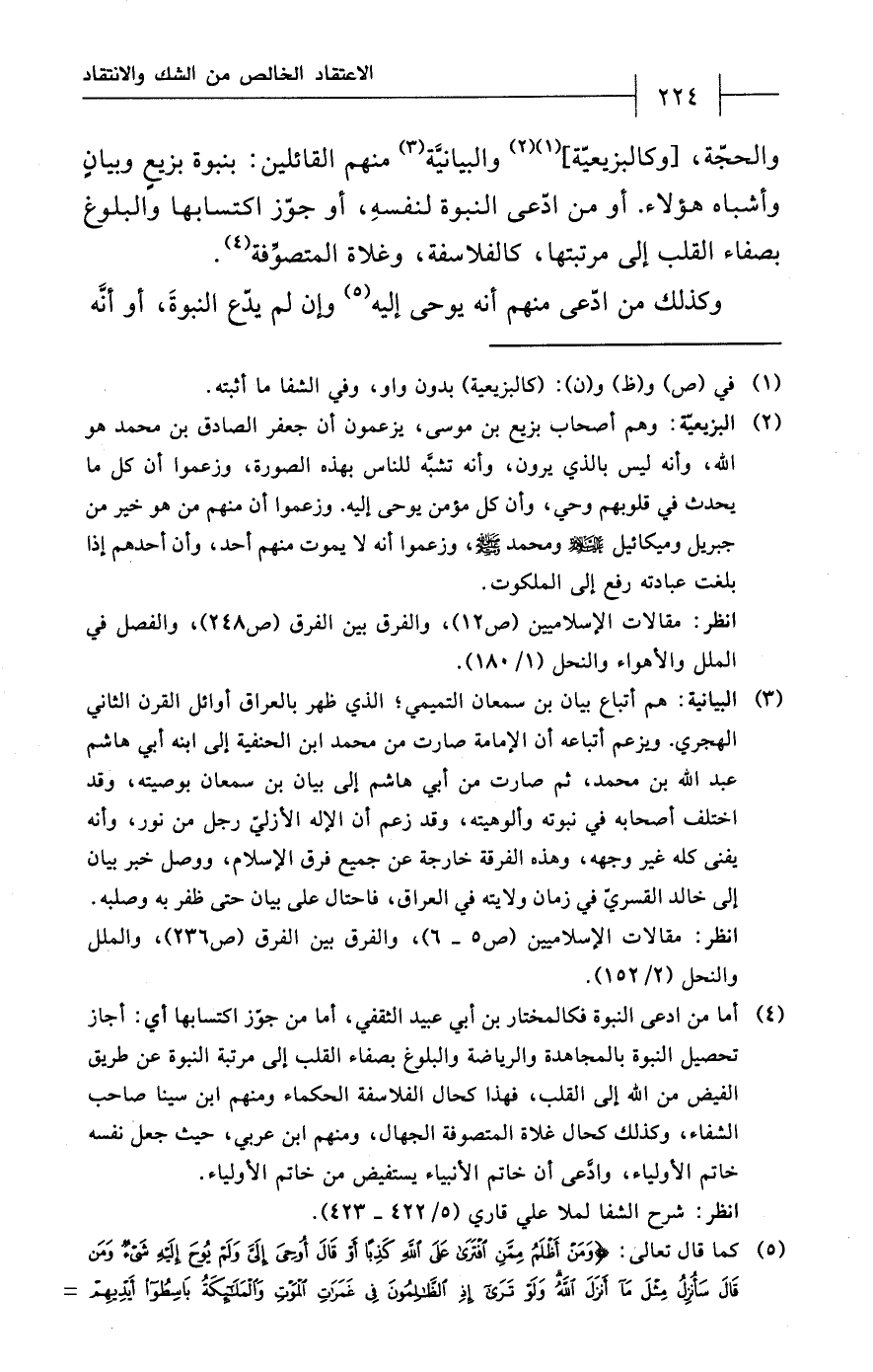 (¬4) أما من ادعى النبوة فكالمختار بن أبي عبيد الثقفي، أما من جوّز اكتسابها أي: أجاز تحصيل النبوة بالمجاهدة والرياضة والبلوغ بصفاء القلب إلى مرتبة النبوة عن طريق الفيض من الله إلى القلب، فهذا كحال الفلاسفة الحكماء ومنهم ابن سينا صاحب الشفاء، وكذلك كحال غلاة المتصوفة الجهال، ومنهم ابن عربي، حيث جعل نفسه خاتم الأولياء، وادَّعى أن خاتم الأنبياء يستفيض من خاتم الأولياء.