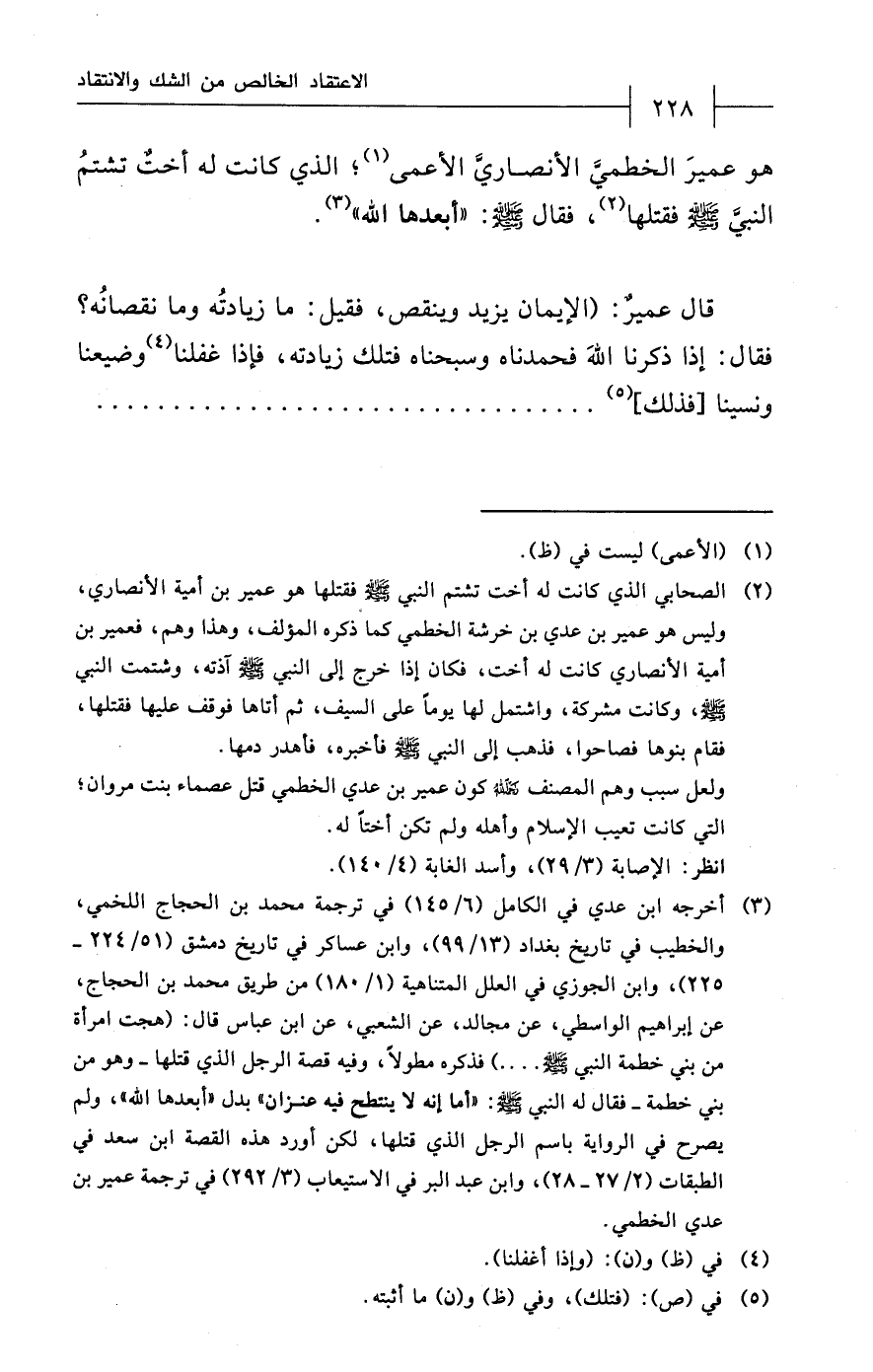 (¬2) الصحابي الذي كانت له أخت تشتم النّبيّ - صلى الله عليه وسلم - فقتلها هو عمير بن أمية الأنصاري، وليس هو عمير بن عدي بن خرشة الخطمي كما ذكره المؤلف، وهذا وهم، فعمير بن أمية الأنصاري كانت له أخت، فكان إذا خرج إلى النّبيّ - صلى الله عليه وسلم - آذته، وشتمت النّبيّ - صلى الله عليه وسلم -، وكانت مشركة، واشتمل لها يوماً على السيف، ثم أتاها فوقف عليها فقتلها، فقام بنوها فصاحوا، فذهب إلى النّبيّ - صلى الله عليه وسلم - فأخبره، فأهدر دمها.