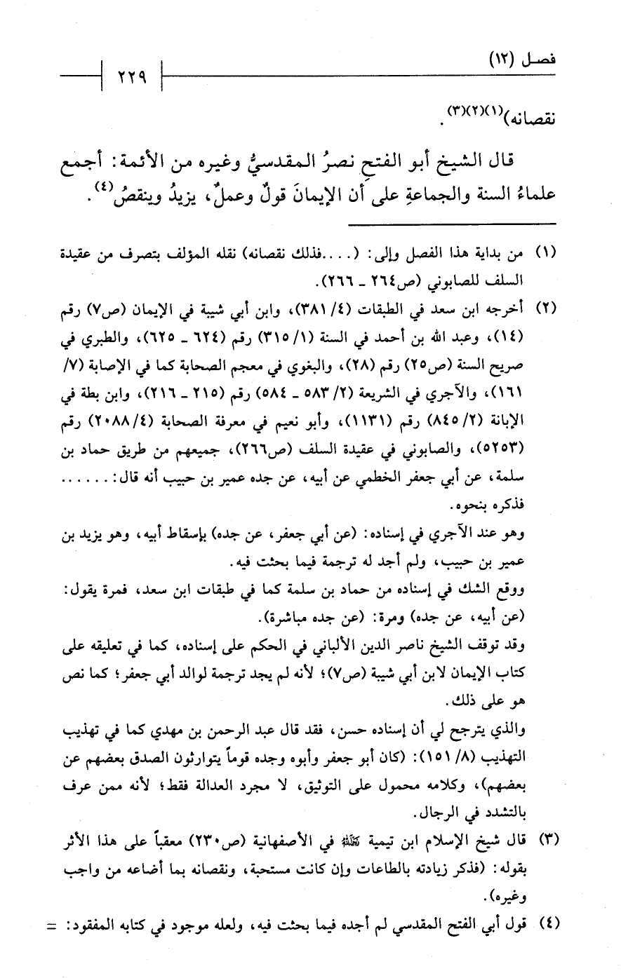 (¬1) من بداية هذا الفصل وإلى: (.... فذلك نقصانه) نقله المؤلف بتصرف من عقيدة السلف للصابوني (ص 264 - 266).