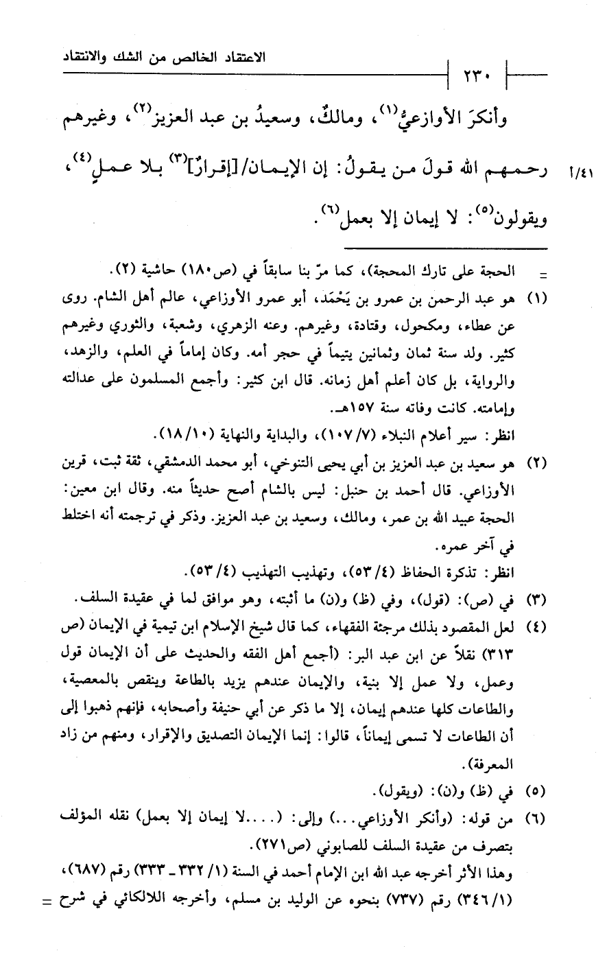(¬4) لعلّ المقصود بذلك مرجئة الفقهاء، كما قال شيخ الإسلام ابن تيمية في الإيمان (ص 313) نقلًا عن ابن عبد البرّ: (أجمع أهل الفقه والحديث على أن الإيمان قول وعمل، ولا عمل إلا بنية، والإيمان عندهم يزيد بالطاعة ويقص بالمعصية، والطاعات كلها عندهم إيمان، إلا ما ذكر عن أبي حنيفة وأصحابه، فإنهم ذهبوا إلى أن الطاعات لا تسمى إيماناً، قالوا: إنّما الإيمان التصديق والإقرار، ومنهم من زاد المعرفة).