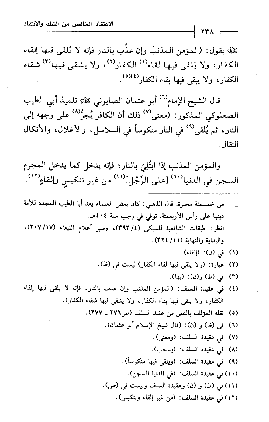 (¬4) في عقيدة السلف: (المؤمّن المذنب وإن عذب بالنار، فإنه لا يلقى فيها إلقاء الكفار، ولا يبقى فيها بقاء الكفار، ولا يشقى فيها شقاء الكفار).