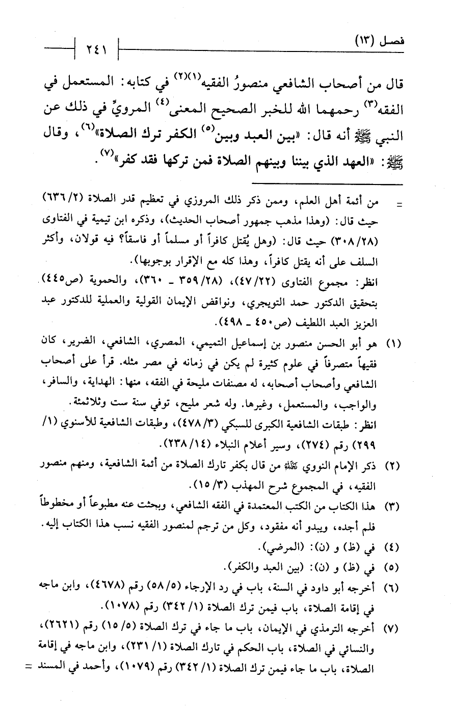 (¬2) ذكر الإمام النووي - رحمه الله - من قال بكفر تارك الصّلاة من أئمة الشافعية، ومنهم منصور الفقيه، في المجموع شرح المهذب (3/ 15).