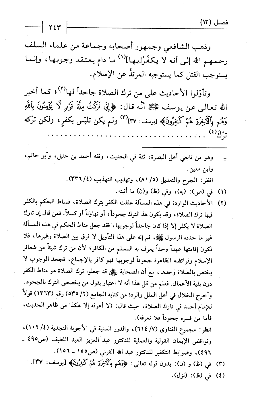 وتأوّلوا الأحاديث على من ترك الصّلاة جاحداً لها (¬2)؛ كما أخبر الله تعالى عن يوسف - عليه السلام - أنَّه قال: {إِنِّي تَرَكْتُ مِلَّةَ قَوْمٍ لَا يُؤْمِنُونَ بِاللَّهِ وَهُمْ بِالْآخِرَةِ هُمْ كَافِرُونَ} [يوسف: 37] (¬3) ولم يكن تلبّس بكفرٍ، ولكن ترْكه ترْكَ (¬4) ....................................